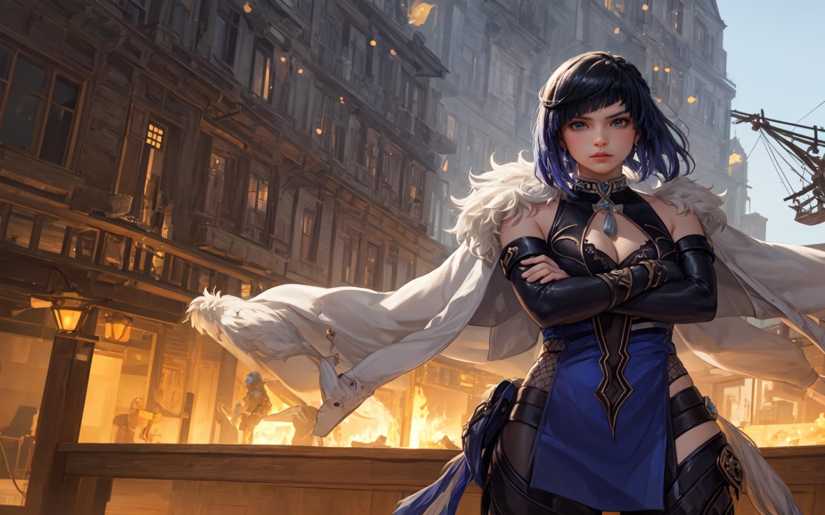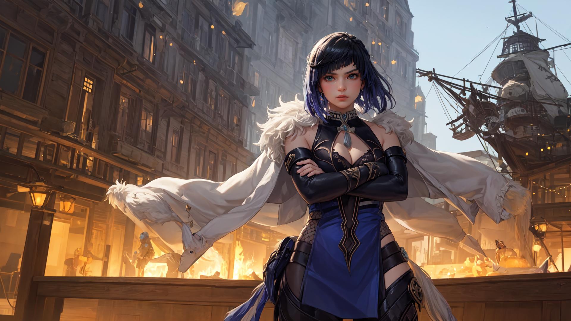 1girl, asymmetrical gloves, bangs, bare shoulders, black gloves, black hair, blue eyes, blue hair, bob cut, cleavage, cleavage cutout, cowboy shot, crossed arms, diagonal bangs , dice, dress, earrings, elbow gloves, fingerless gloves, fur trim, gloves, green eyes, jacket, jacket on shoulders, jewelry, large breasts, looking at viewer, mismatched gloves, mole, mole on breast, multicolored hair, multiple girls, outdoors, ship, short hair, sky, sleeveless, solo focus, standing, tassel, watercraft, white jacket