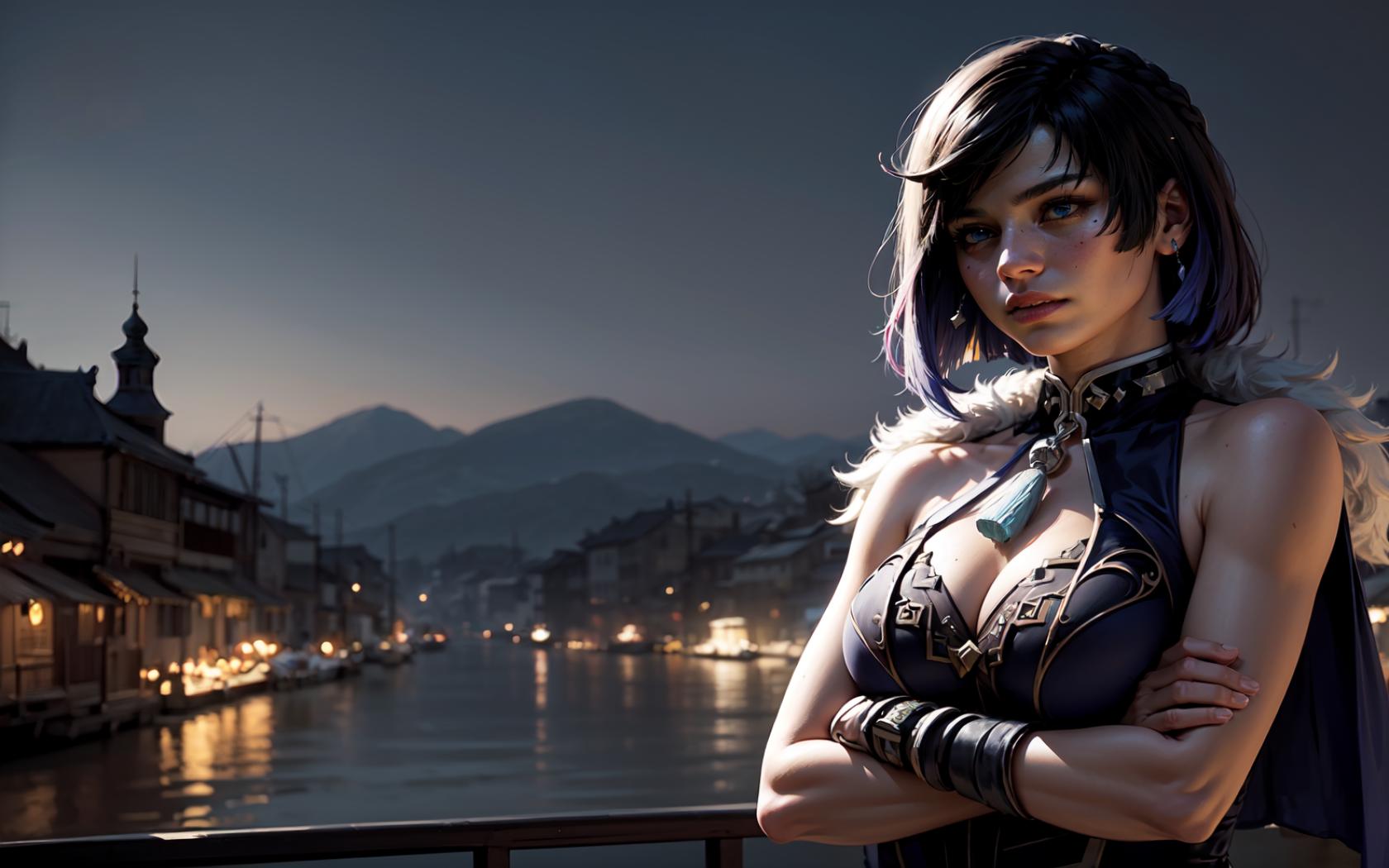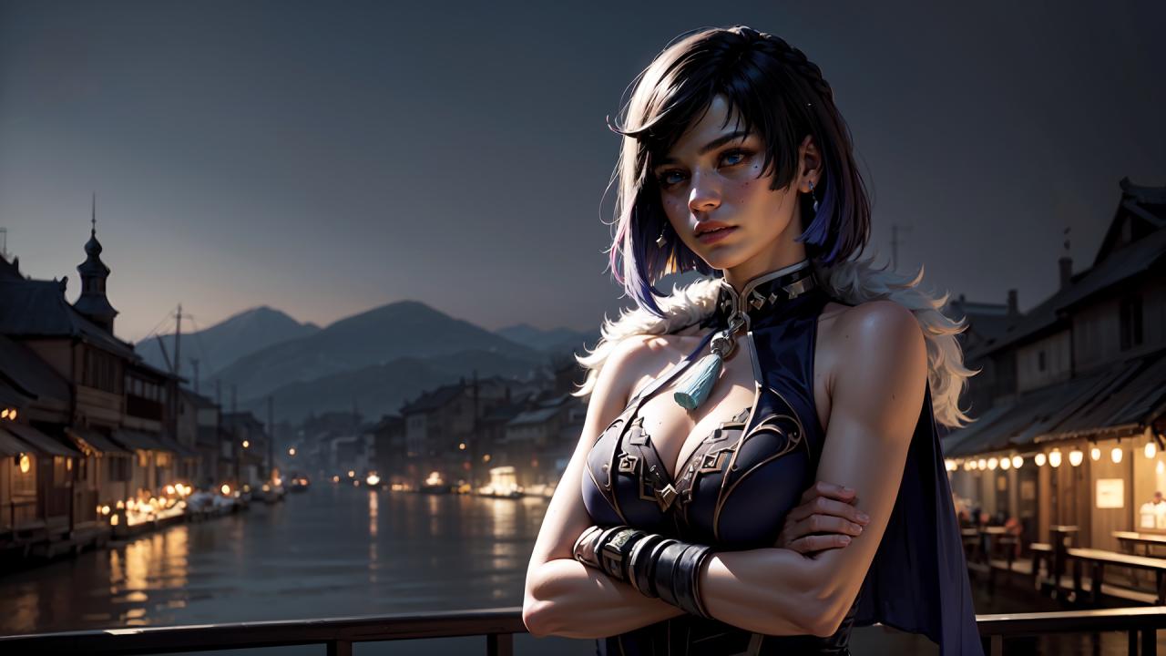 1girl, architecture, bangs, bare shoulders, black hair, blue eyes, blue hair, bob cut, cape, cleavage, cleavage cutout, crossed arms, dress, earrings, east asian architecture , fur trim, green eyes, jewelry, large breasts, looking at viewer, mole, mole on breast, multicolored hair, night, outdoors, parted lips, realistic, short hair, sky, sleeveless, sleeveless dress, solo, upper body