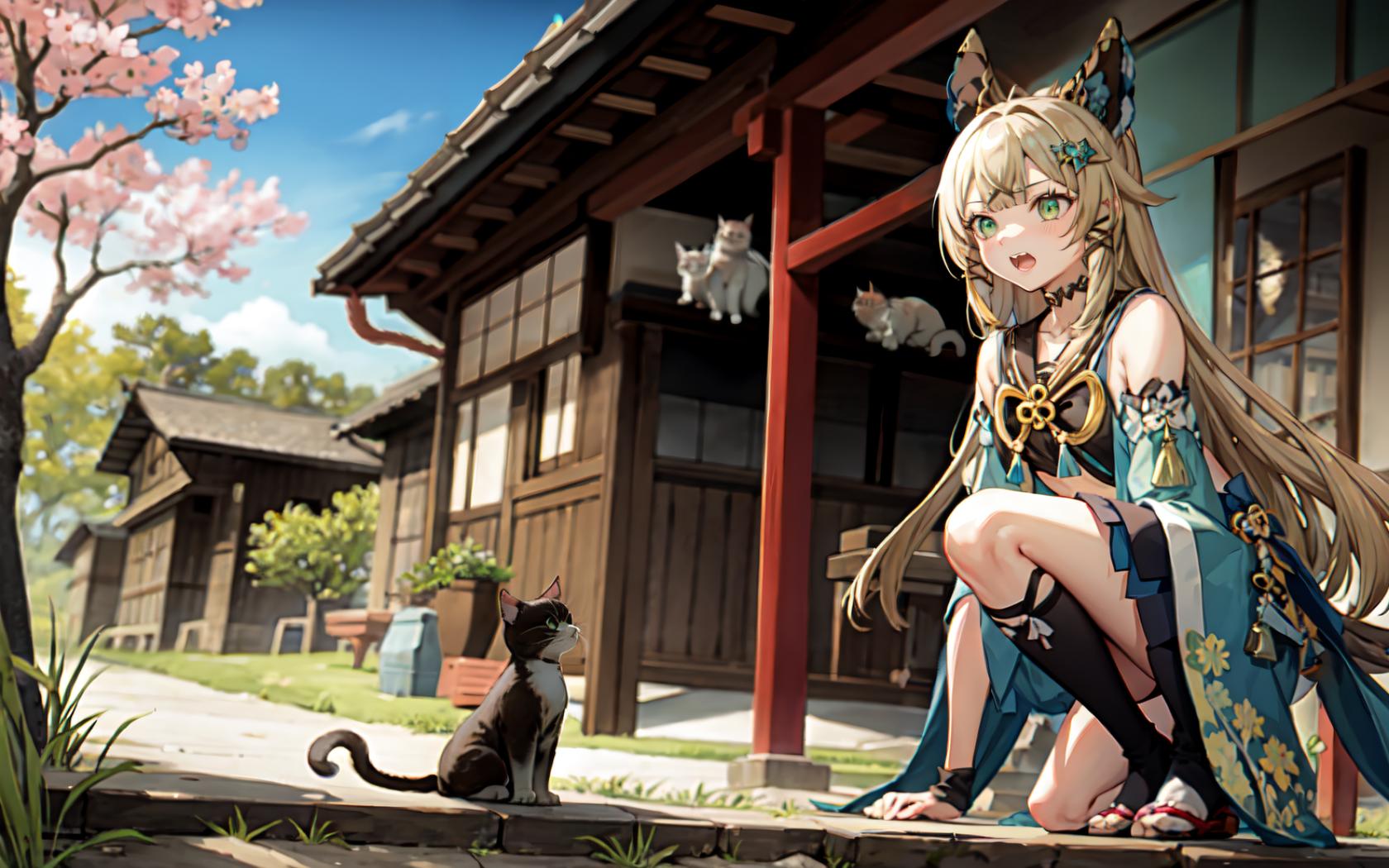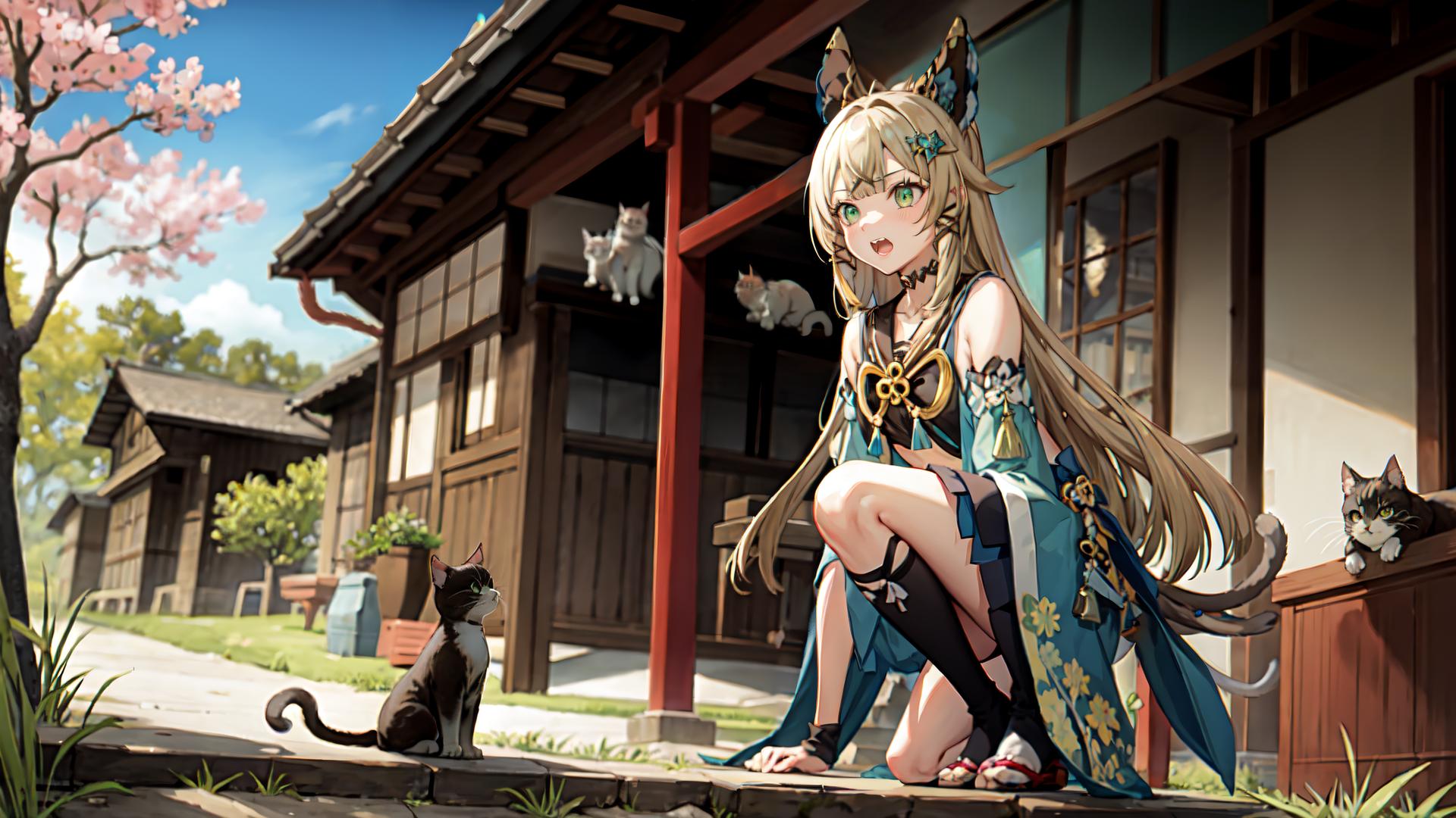 1girl, ahoge, animal, animal ears, architecture, bangs, bare shoulders, bell, black cat, blonde hair, blush, building, cat, cat ears, cat girl, cat tail, cherry blossoms, choker, day, detached sleeves, east asian architecture, fang, grass, green eyes, hair ornament, japanese clothes, jingle bell, kneehighs, long hair, long sleeves, looking at animal , open mouth, outdoors, sandals, sidelocks, skirt, sky, sleeveless, socks, solo, squatting, tail, tree, very long hair, wide sleeves