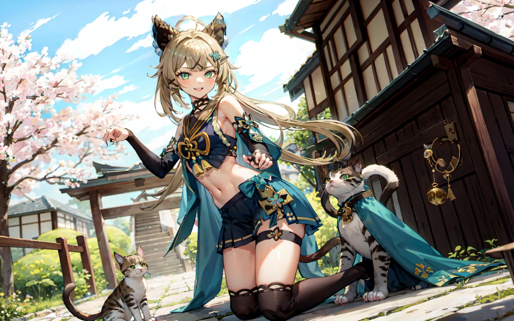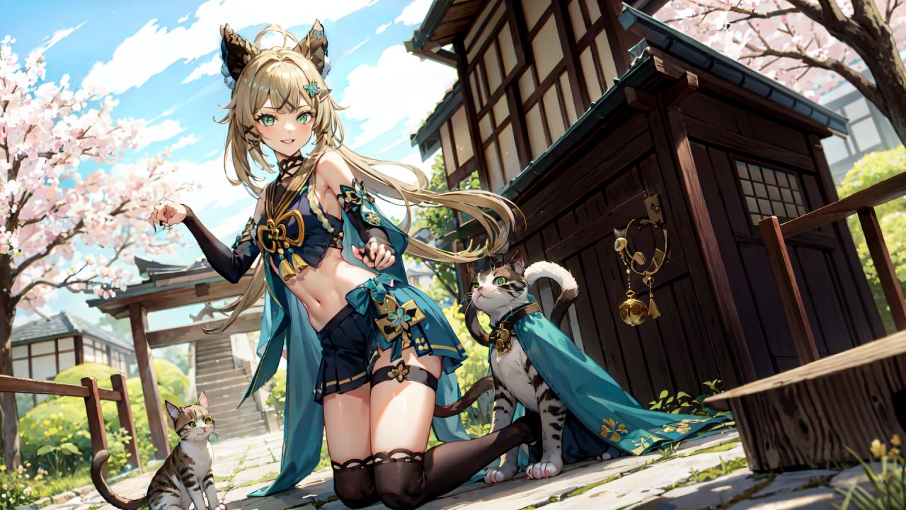 1girl, :d, ahoge, animal, animal ears, architecture, bare shoulders, bell, black choker, black shirt, black thighhighs, blonde hair, blue shirt, blue skirt, cat, cat ears, cat girl, cat tail, cherry blossoms, choker, crop top, day, detached sleeves, east asian architecture , fang, full body, gold trim, green eyes, hair ornament, jingle bell, kneeling, long hair, long sleeves, looking at viewer, medium breasts, midriff, miniskirt, navel, open mouth, outdoors, petals, pleated skirt, revealing clothes, shirt, skirt, sleeveless, sleeveless shirt, smile, solo, stomach, tail, thigh strap, thighhighs, tree, twintails, very long hair, zettai ryouiki
