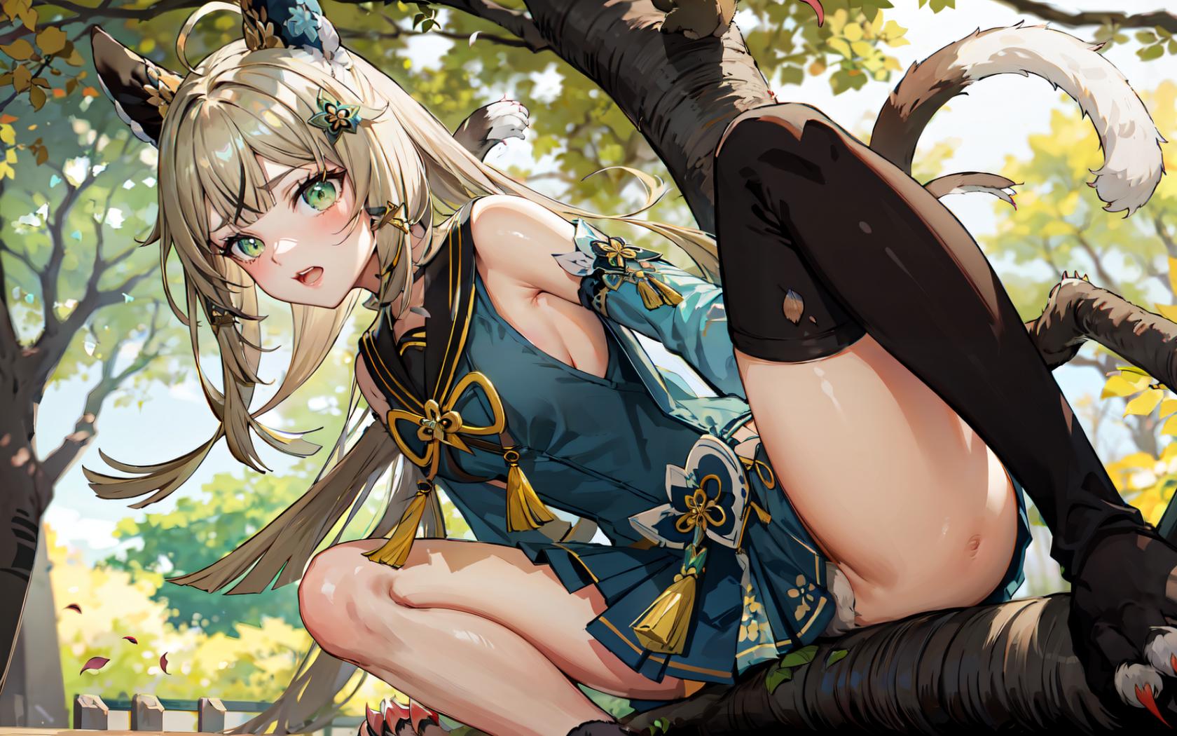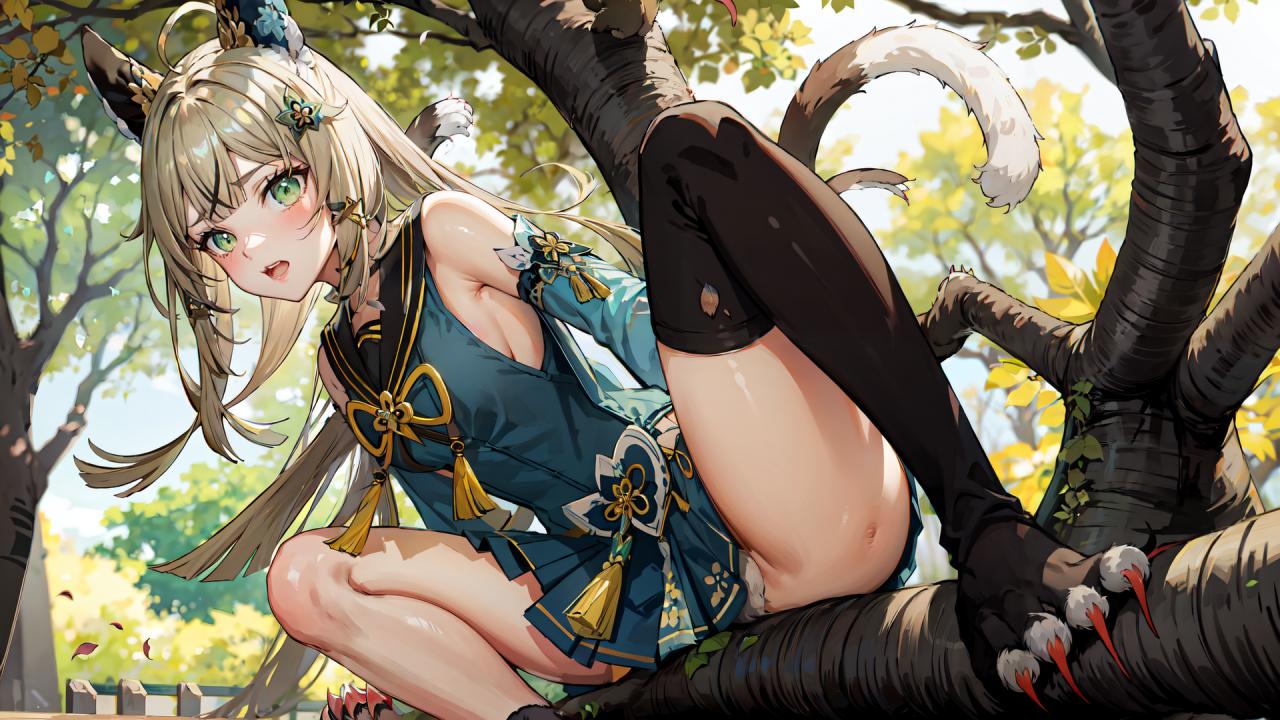 1girl, ahoge, animal ear fluff, animal ears, bangs, bare shoulders, black thighhighs, blue skirt, blush, branch, cat ears, cat girl, cat tail, choker, day, detached sleeves, green eyes, hair ornament, in tree , knee up, long hair, long sleeves, looking at viewer, medium breasts, miniskirt, open mouth, outdoors, panties, pleated skirt, sailor collar, shirt, sideboob, single thighhigh, sitting, skirt, sleeveless, small breasts, solo, spread legs, tail, tassel, thighhighs, tree, underwear, white panties