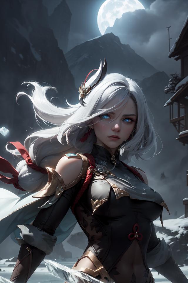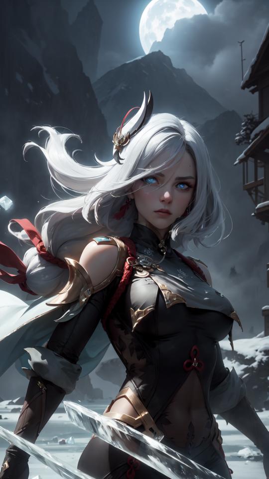 1girl, bangs, black bodysuit, black gloves, blue eyes, bodysuit, braid, braided ponytail, breast curtain , clothing cutout, cloud, cloudy sky, covered navel, cowboy shot, earrings, floating hair, full moon, gloves, glowing, gold trim, hair ornament, hair over one eye, hip vent, jewelry, large breasts, long hair, looking at viewer, medium breasts, moon, mountain, night, night sky, outdoors, parted lips, partially fingerless gloves, polearm, shoulder cutout, sky, solo, tassel, tassel earrings, very long hair, weapon, white hair, wind