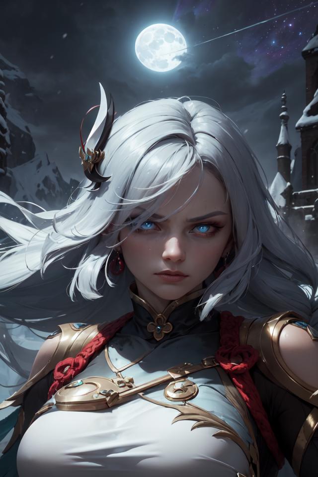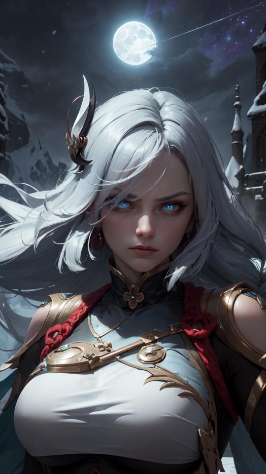1girl, bangs, black bodysuit, blue eyes, bodysuit, braided ponytail, breast curtain , closed mouth, clothing cutout, cloud, earrings, eyelashes, full moon, glowing, gold trim, grey hair, hair ornament, hair over one eye, jewelry, large breasts, long hair, looking at viewer, moon, night, night sky, outdoors, shoulder cutout, sky, solo, star (sky), starry sky, tassel, tassel earrings, upper body, white hair