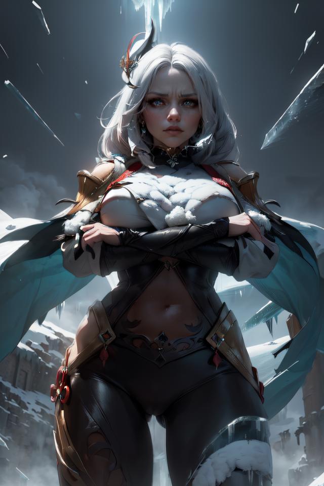 an artistic rendering of a woman in armor with a large sword in her hand and an angry look on her face with white hair and blue eyes