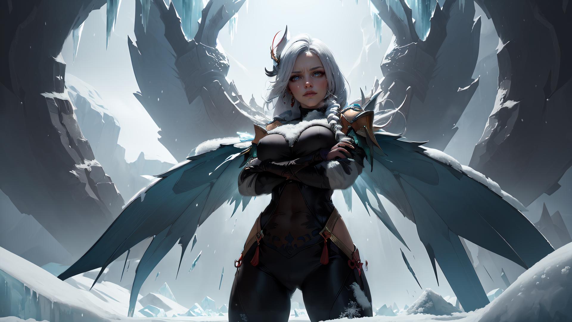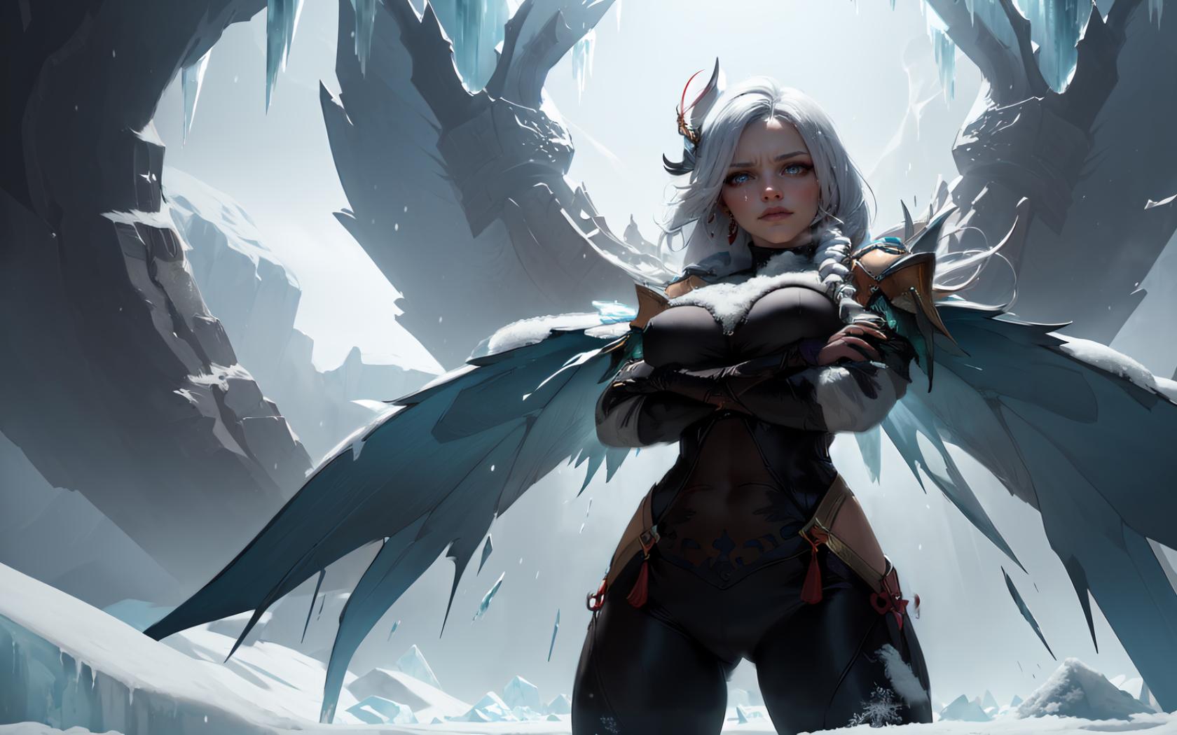 1girl, ass visible through thighs, bangs, black bodysuit, blue eyes, bodysuit, braid, braided ponytail, breast curtain , cosplay, covered navel, crossed arms, earrings, gloves, hair ornament, hip vent, ice, jewelry, large breasts, long hair, looking at viewer, parted lips, partially fingerless gloves, snow, solo, standing, tassel, tassel earrings, white hair, wings