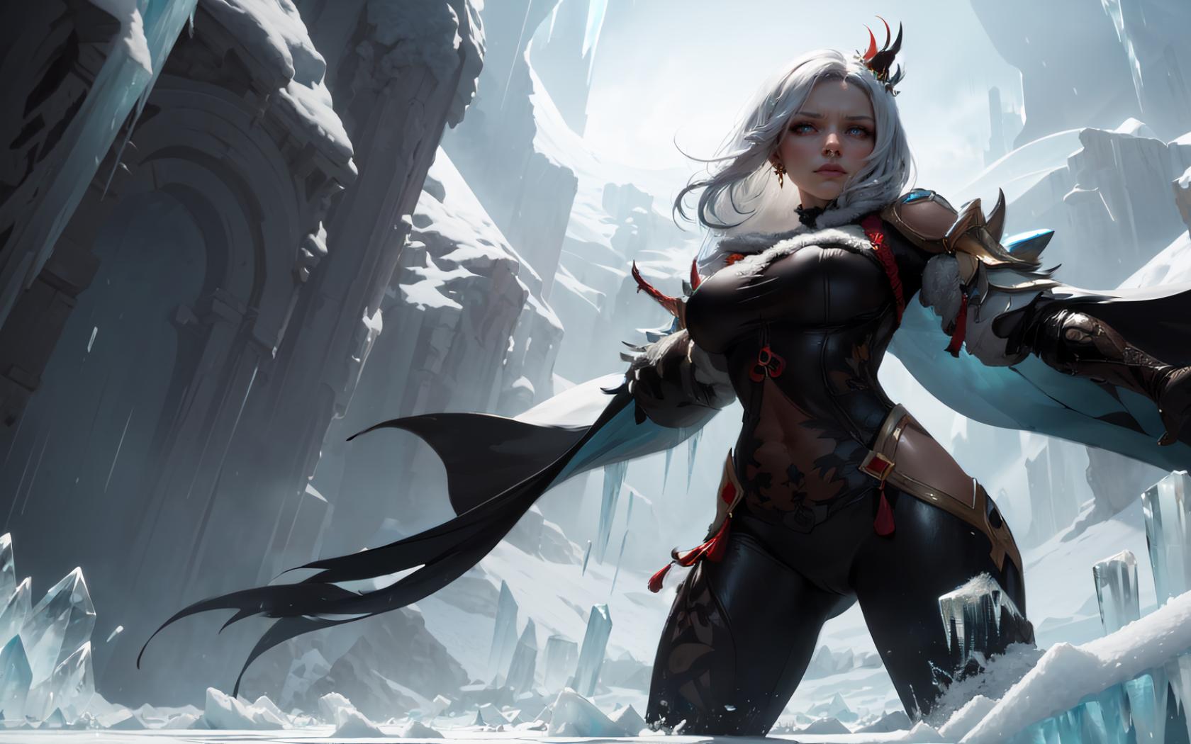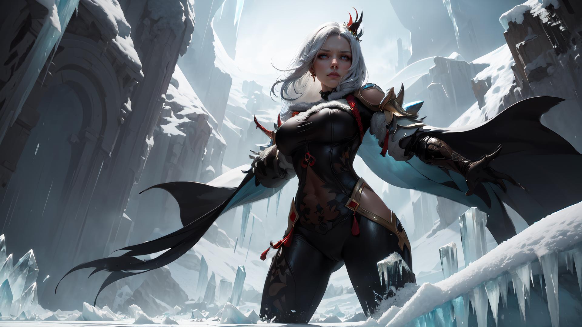 1girl, ass visible through thighs, bangs, black bodysuit, black gloves, blue eyes, bodysuit, braid, braided ponytail, cape, clothing cutout, covered navel, earrings, from below, gloves, gold trim, hair ornament, hip vent, ice, jewelry, large breasts, long hair, looking at viewer, parted lips, shoulder cutout, solo, standing, tassel, tassel earrings , very long hair, white hair
