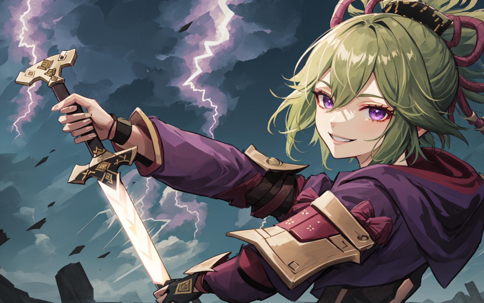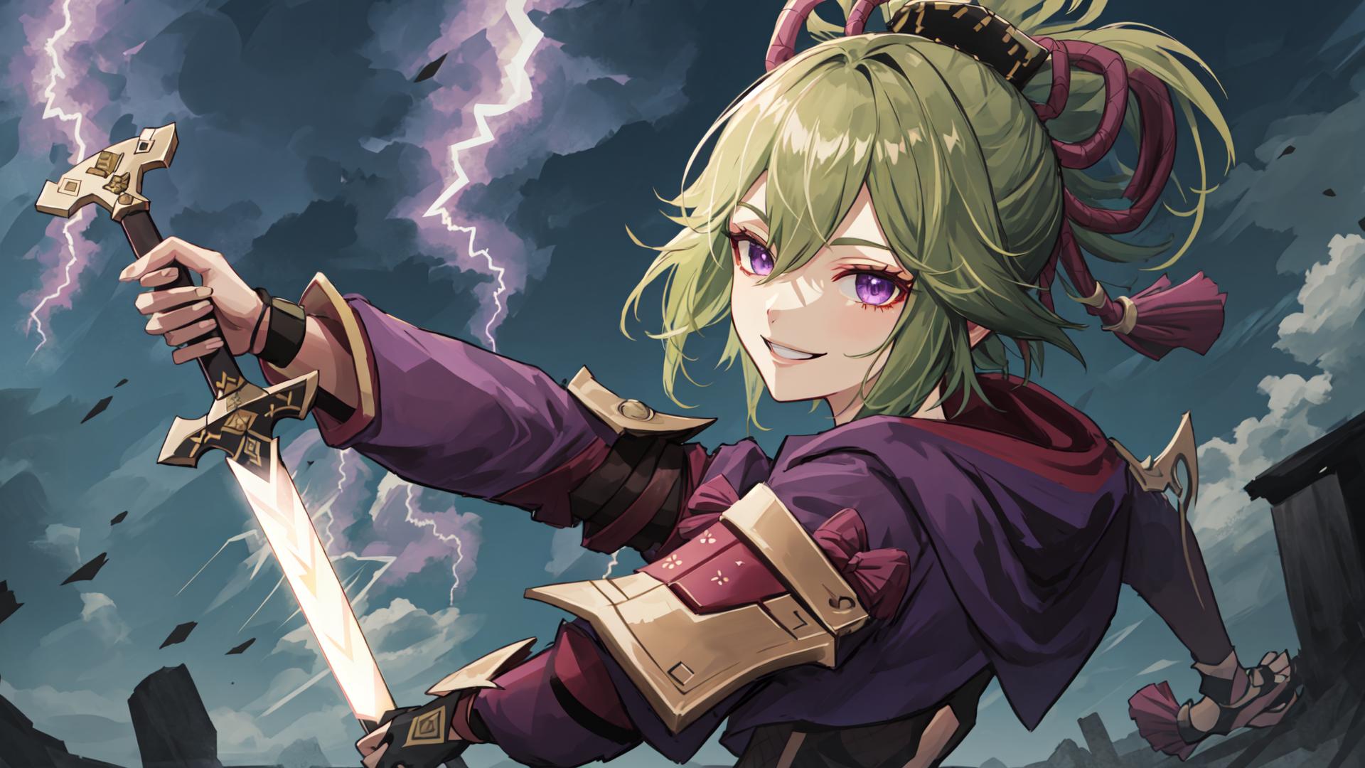 1girl, armor, bangs, cloud, cloudy sky, electricity, gloves, green hair, grin, hair between eyes, hair ornament, holding, holding sword, holding weapon, hood, hood down, jacket, lightning , long sleeves, looking at viewer, looking back, looking to the side, outdoors, ponytail, purple eyes, purple jacket, reverse grip, rope, shimenawa, sky, smile, solo, sword, upper body, weapon