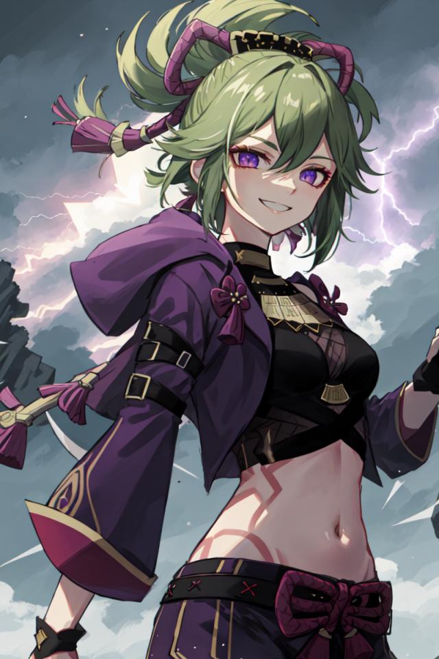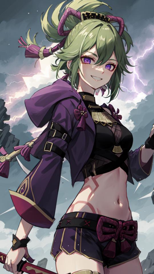 1girl, bangs, black gloves, black shirt, black shorts, body markings, cloud, cowboy shot, crop top, cropped jacket, fishnet top , fishnets, gloves, green hair, grin, hair between eyes, hair ornament, holding, holding dagger, holding knife, holding sword, holding weapon, hood, hood down, hooded jacket, jacket, long sleeves, looking at viewer, medium breasts, midriff, navel, open clothes, open jacket, ponytail, purple eyes, purple jacket, reverse grip, shimenawa, shirt, short shorts, shorts, sidelocks, sky, smile, solo, standing, stomach, sword, tassel, weapon