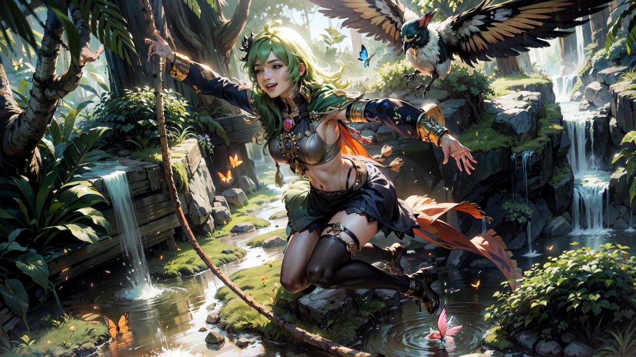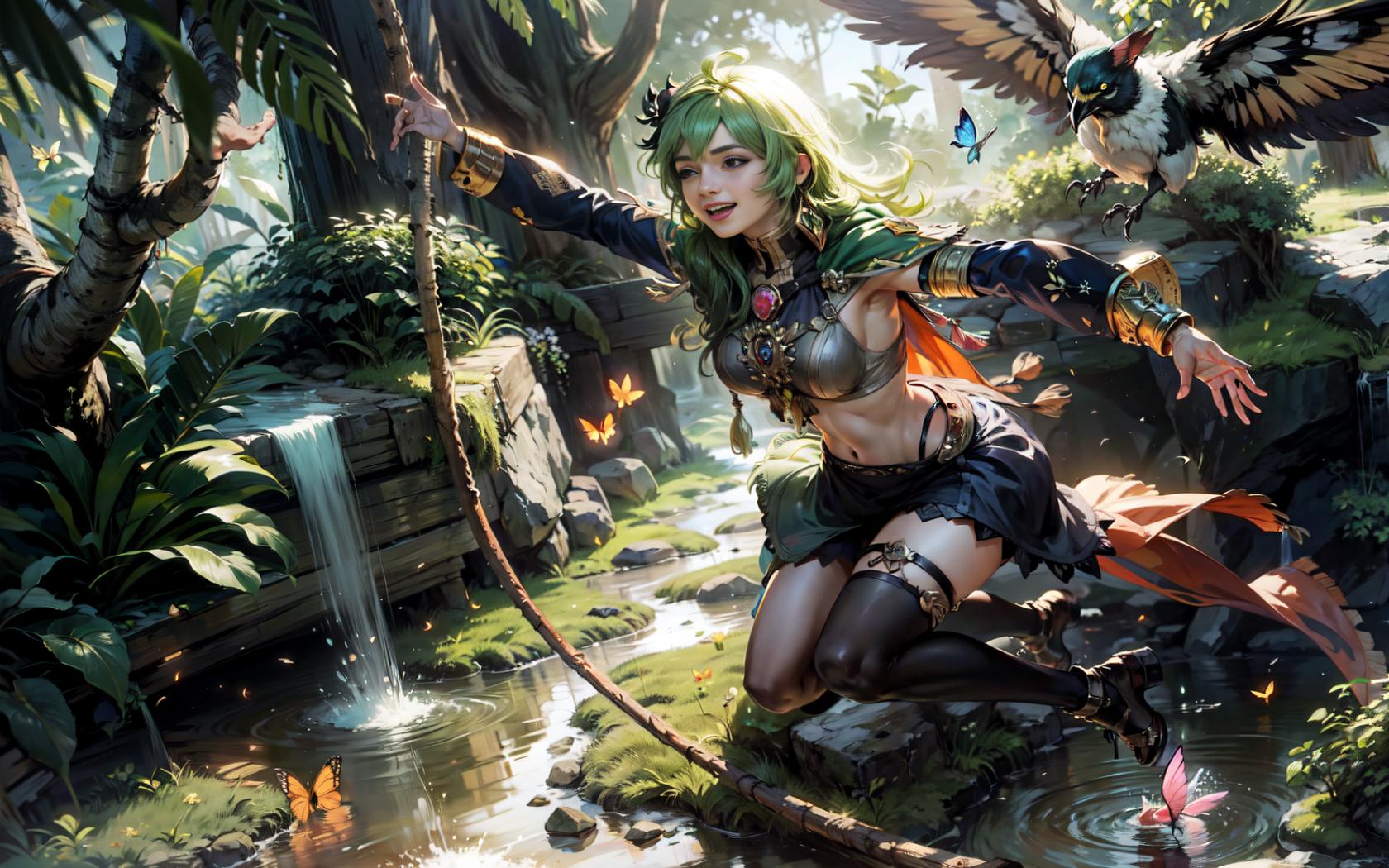 1girl, animal, bangs, bird, black skirt, black thighhighs, bug, butterfly, cape, detached sleeves, earrings, forest, green eyes, green hair, high heels, jewelry, kneeling, long hair, medium breasts, midriff, nature, navel, outdoors, outstretched arms, rock, single thighhigh, skirt, smile, solo, sunlight, thighhighs, tree, underwear, water, waterfall , weapon