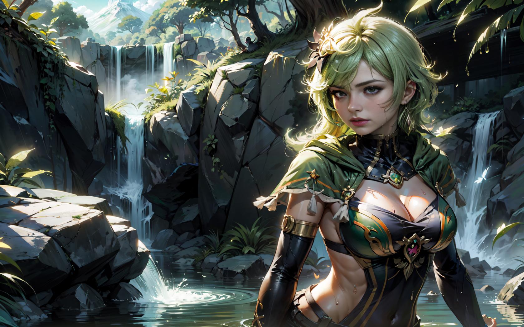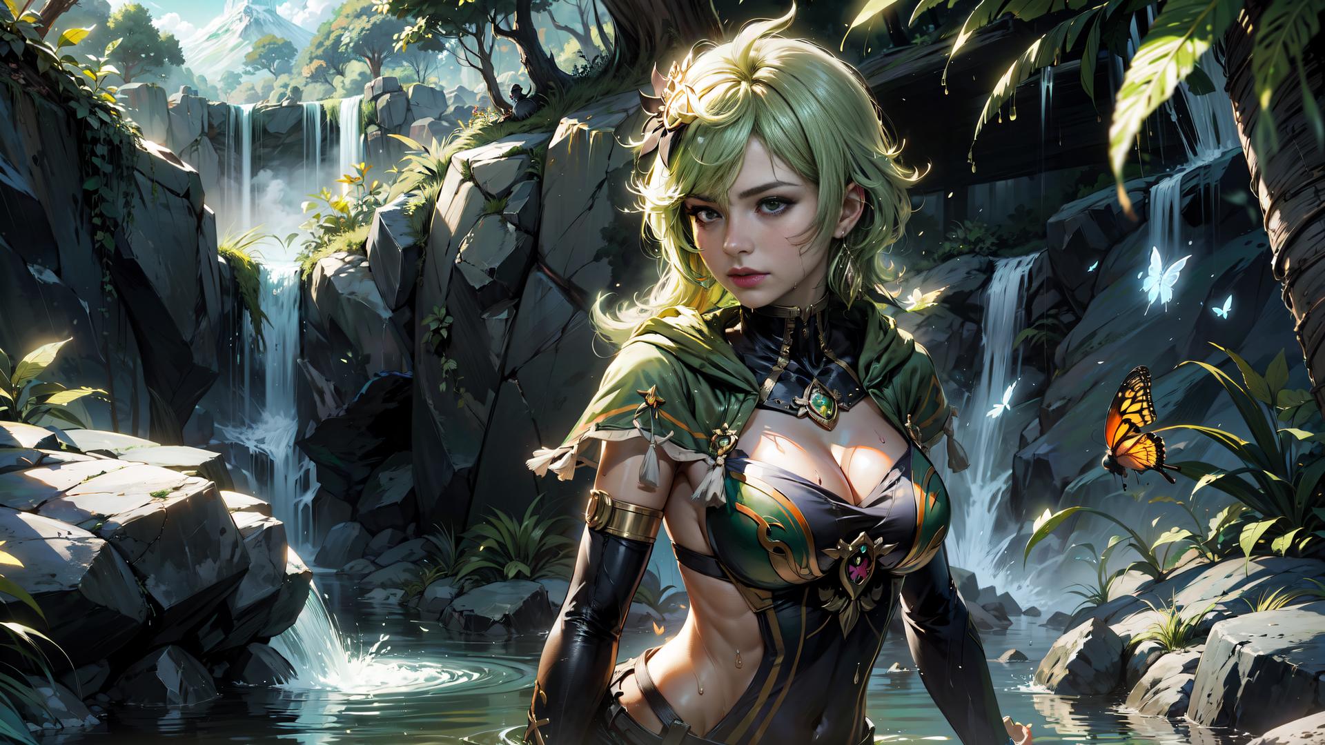 1girl, bangs, blonde hair, bug, butterfly, capelet, cleavage, closed mouth, covered navel, day, detached sleeves, earrings, elbow gloves, forest, gloves, green hair, jewelry, large breasts, medium breasts, mole, mole on breast, moss , nature, outdoors, rock, short hair, solo, sunlight, tree, upper body, water, waterfall, wet