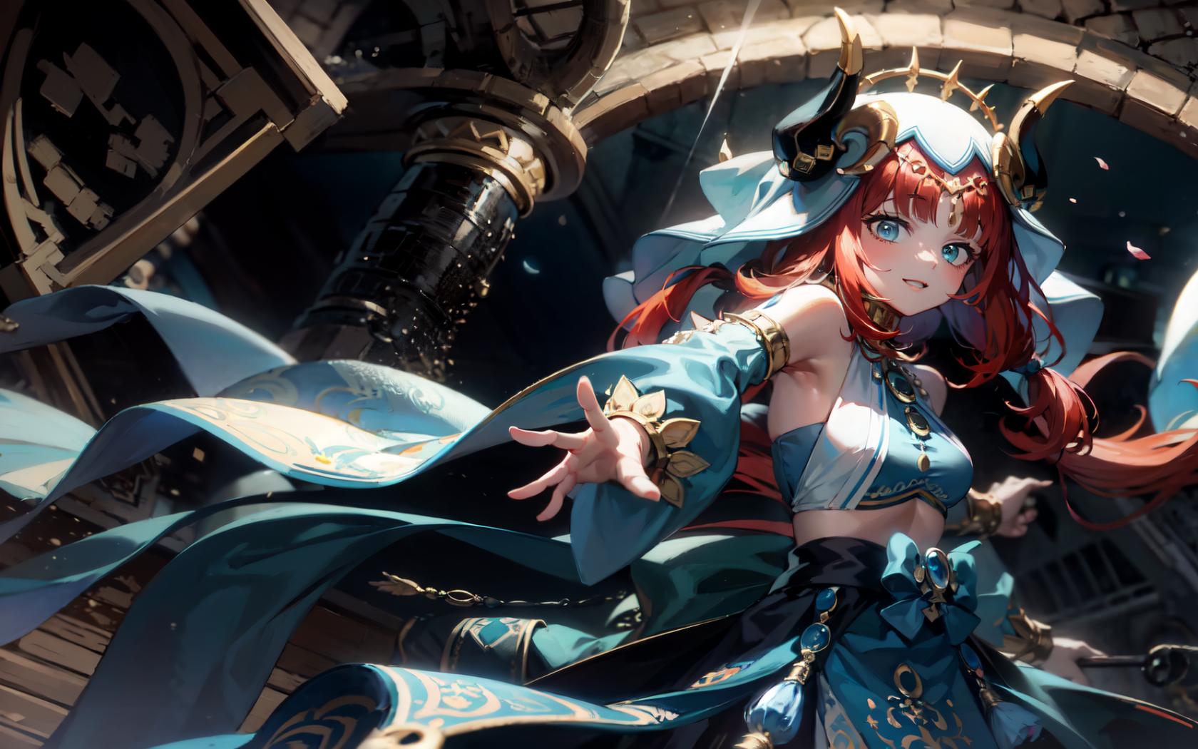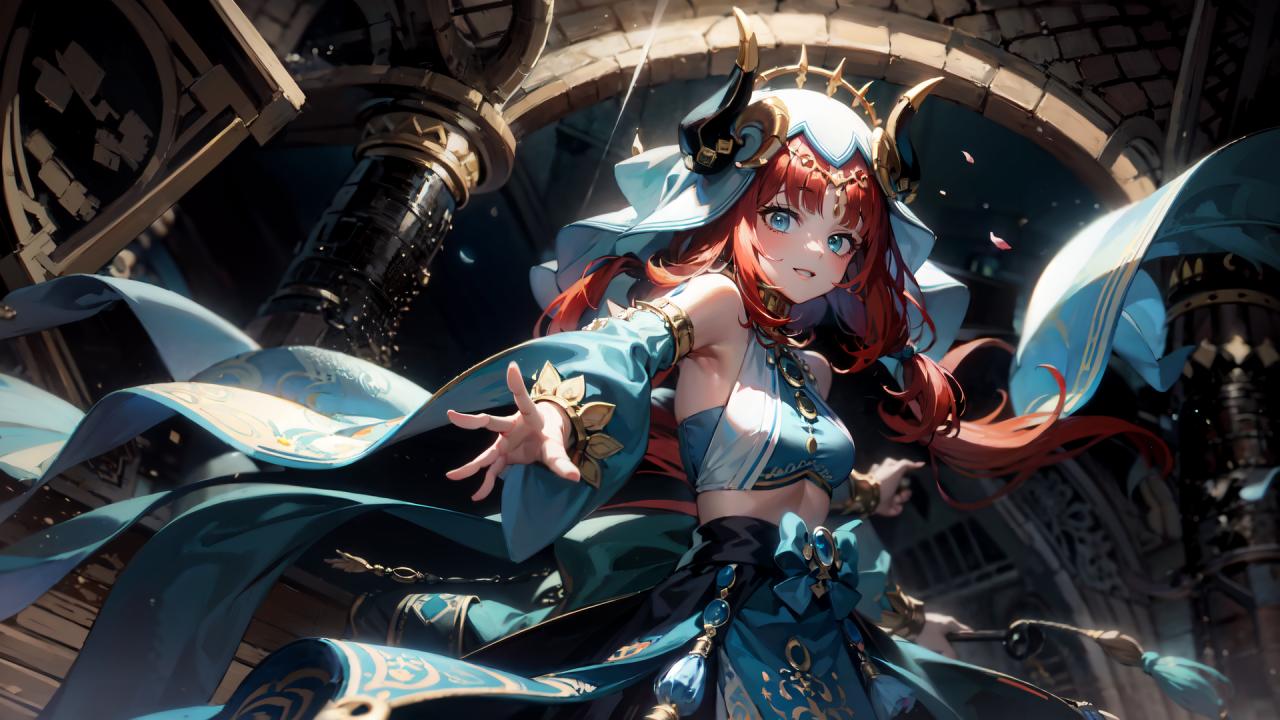 1girl, bangs, bare shoulders, blue bow, blue eyes, blue gemstone, blue nails, blue skirt, blush, bow, bracer, brooch, circlet, crop top, detached sleeves, fake horns, floating hair, gold trim, harem outfit , horns, indoors, jewelry, long hair, long sleeves, looking at viewer, low twintails, medium breasts, neck ring, outstretched arm, outstretched hand, parted bangs, parted lips, puffy long sleeves, puffy sleeves, red hair, sidelocks, skirt, smile, solo, tassel, twintails, veil