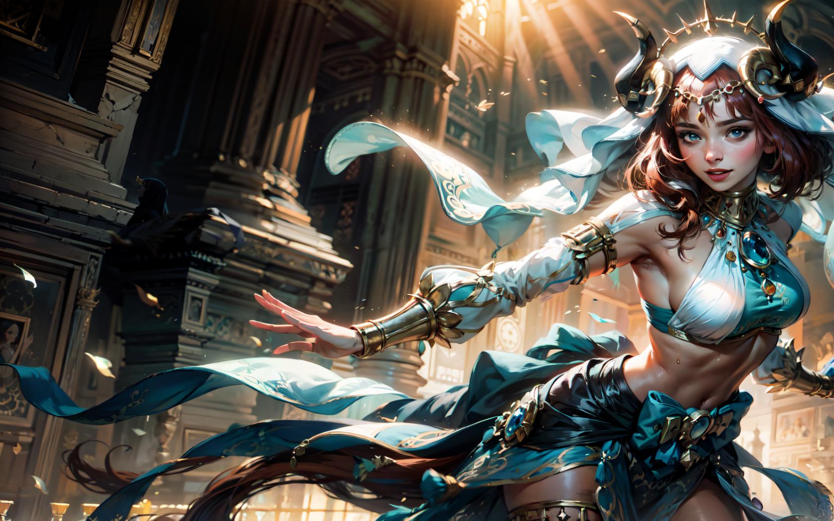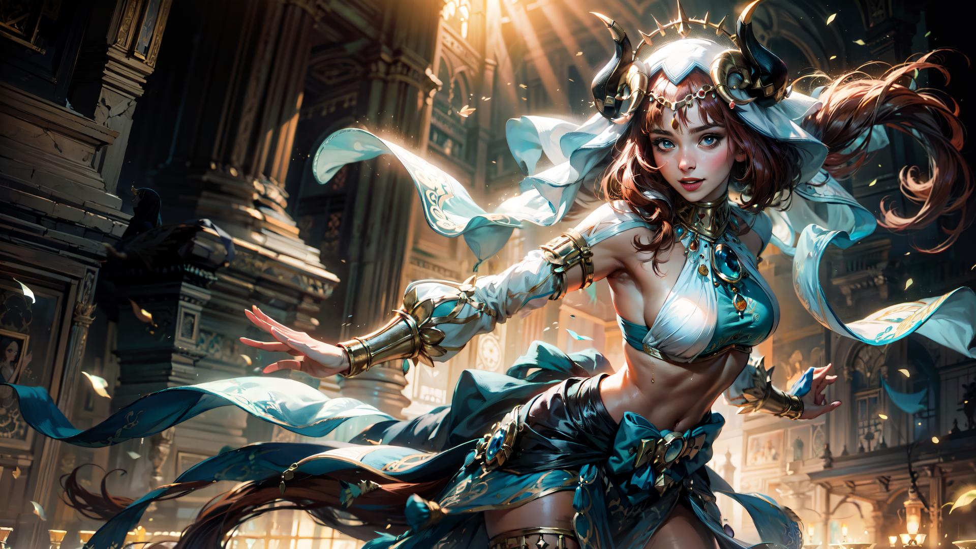 1girl, armlet, armpits, bangs, bare shoulders, blue eyes, bracer, brooch, circlet, crop top, detached sleeves, fake horns, floating hair, horns, jewelry, long hair, long sleeves, looking at viewer, medium breasts, midriff, navel, neck ring , parted lips, puffy sleeves, realistic, red hair, skirt, smile, solo, stomach, thighlet, twintails, veil
