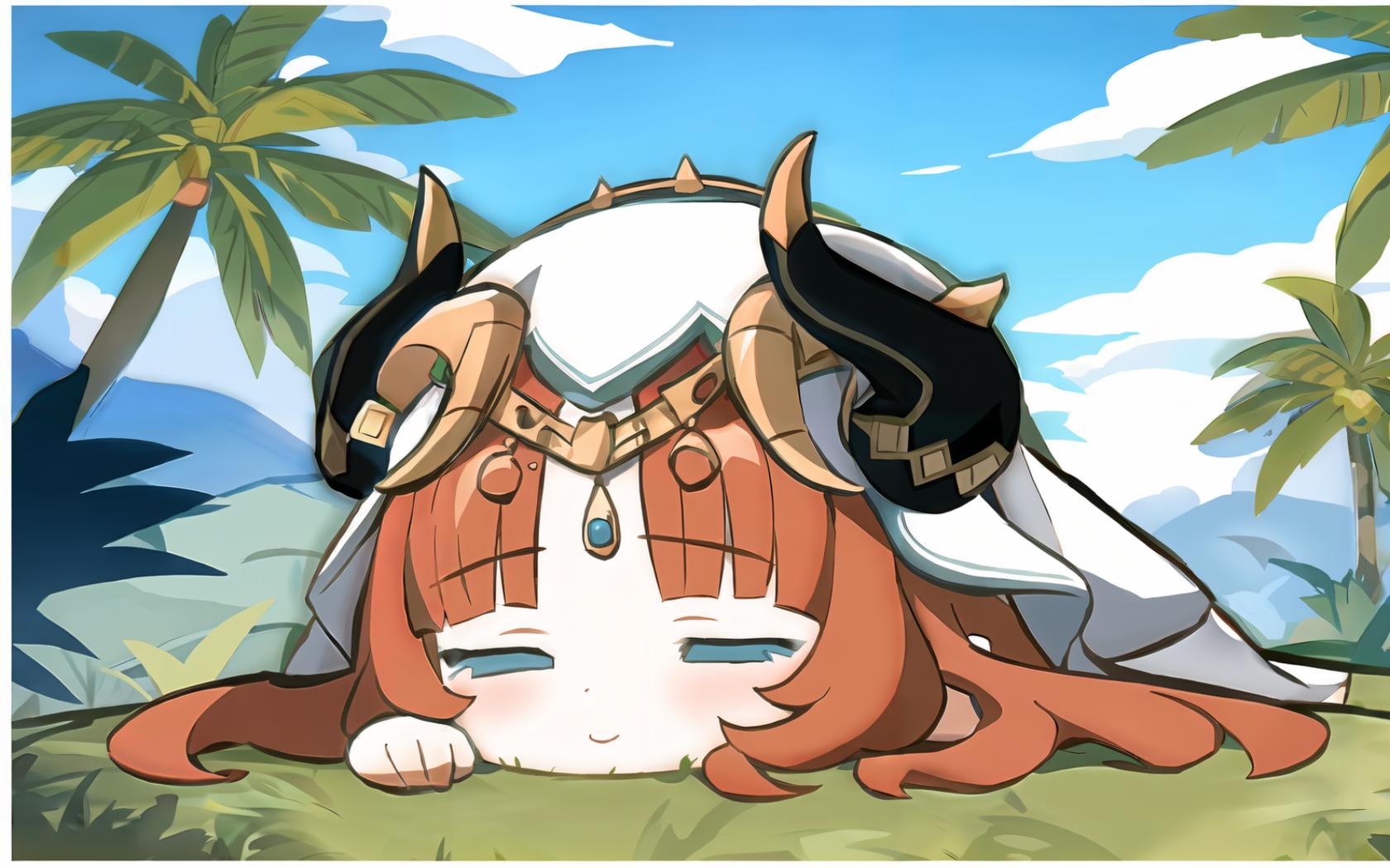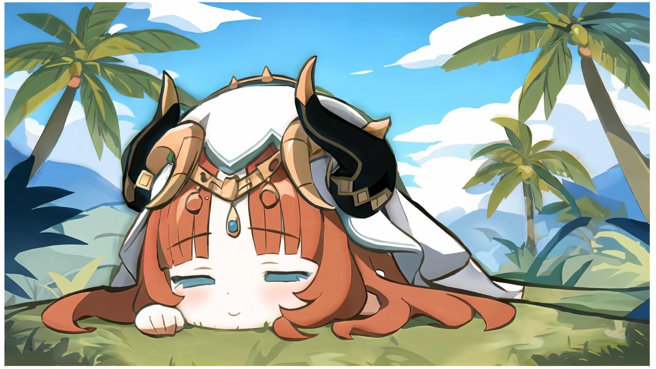 1girl, bangs, blue sky, blush, chibi, closed eyes, closed mouth, cloud, day, facing viewer, fake horns , horns, long hair, lying, on stomach, outdoors, palm tree, parted bangs, red hair, sky, smile, solo, tree, veil