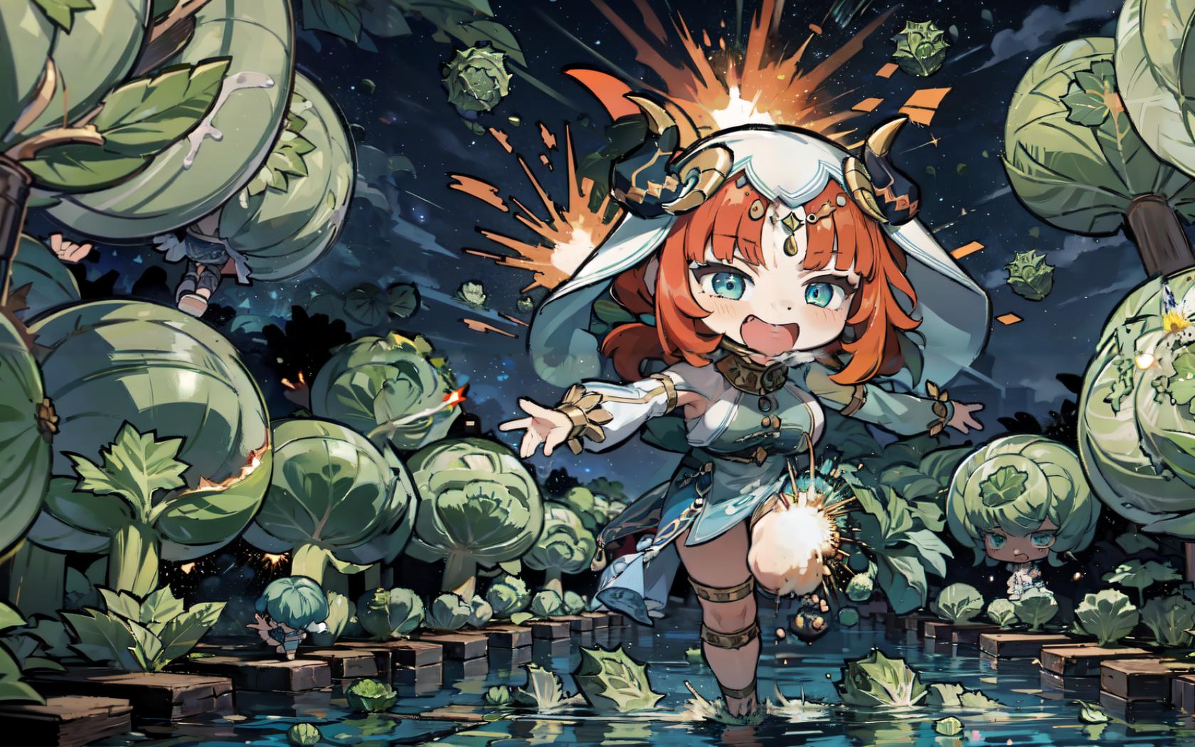 1girl, :d, bangs, blue eyes, blush, chibi, dancer, dancing, detached sleeves, fake horns, harem outfit , horns, jewelry, leaf, long hair, long sleeves, looking at viewer, medium breasts, night, open mouth, outdoors, plant, puffy long sleeves, puffy sleeves, red hair, smile, standing, standing on one leg, thighlet, twintails, veil, water
