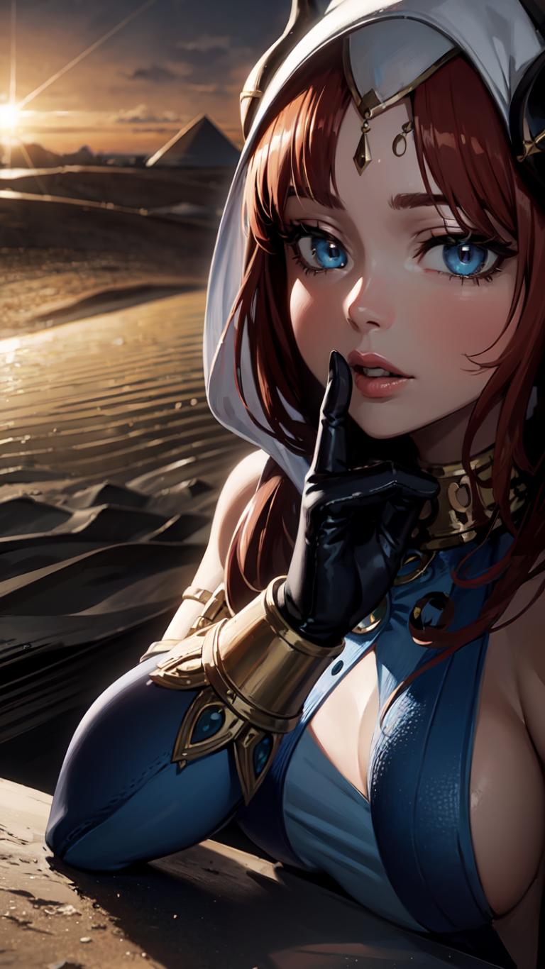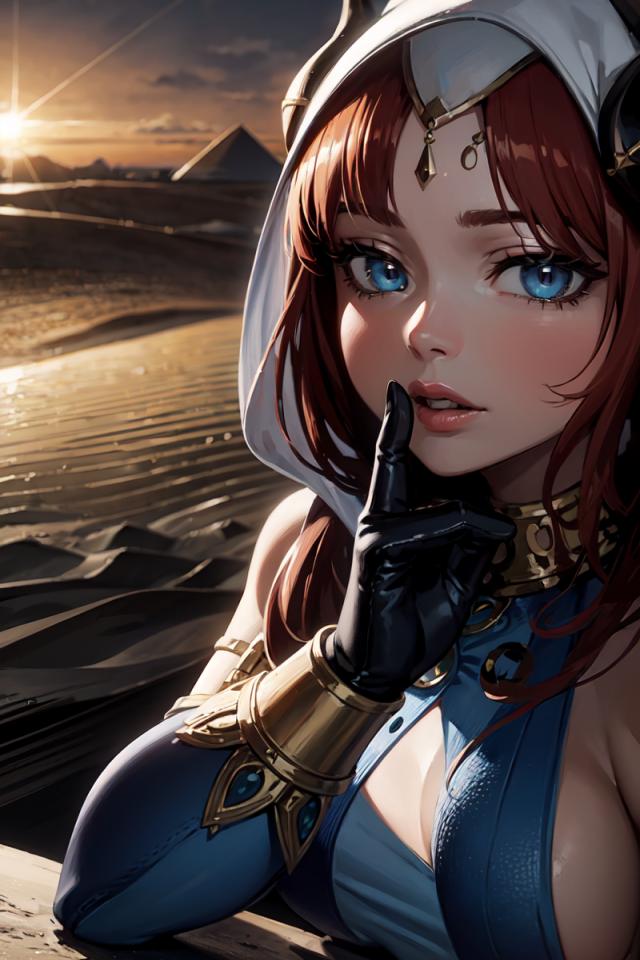 1girl, bangs, bare shoulders, black gloves, blue eyes, bracer, cleavage, clothing cutout, elbow gloves, finger to mouth, gloves, hood, horns, index finger raised, jewelry, large breasts, long hair, looking at viewer, medium breasts, neck ring, outdoors, parted lips, red hair, shushing , solo, sunset, upper body, veil