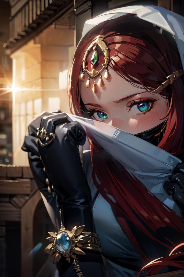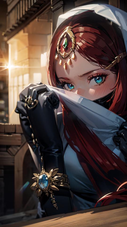 an anime girl with red hair and goggles on, holding a sword in her hand, sitting down in front of a window frame