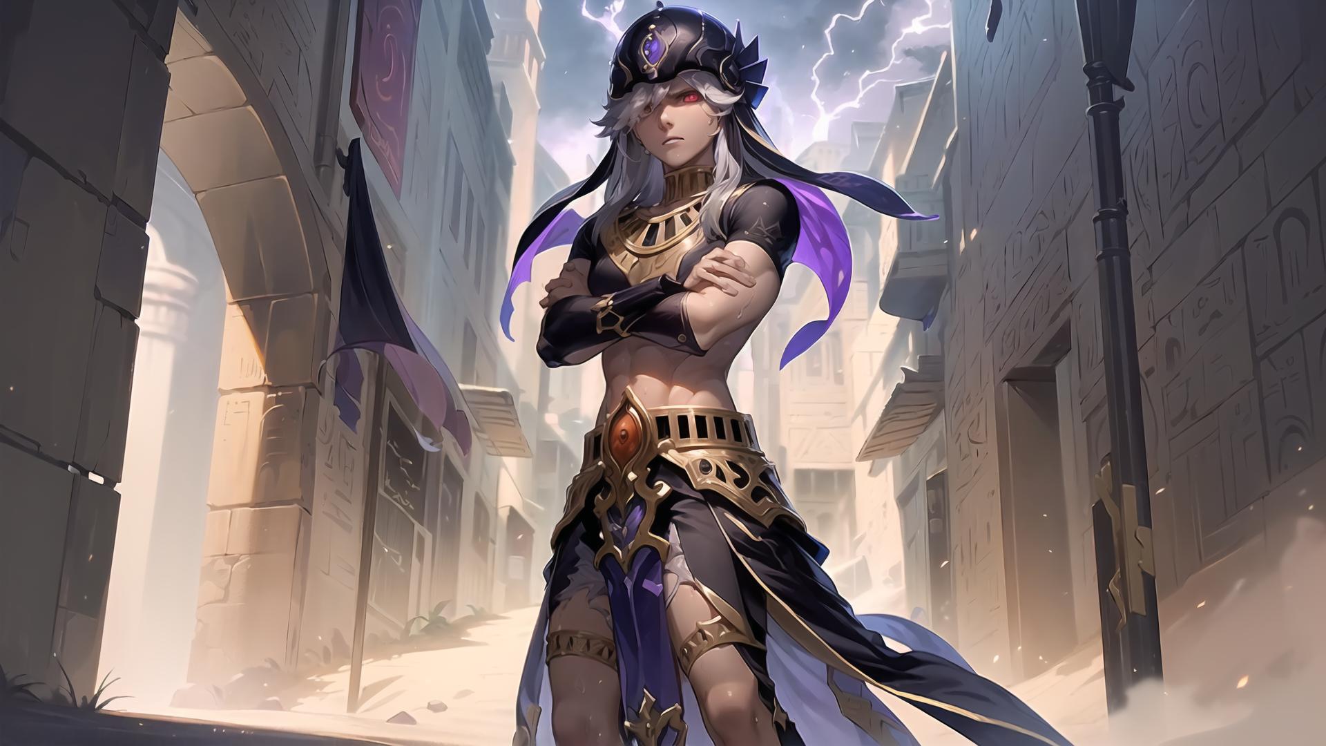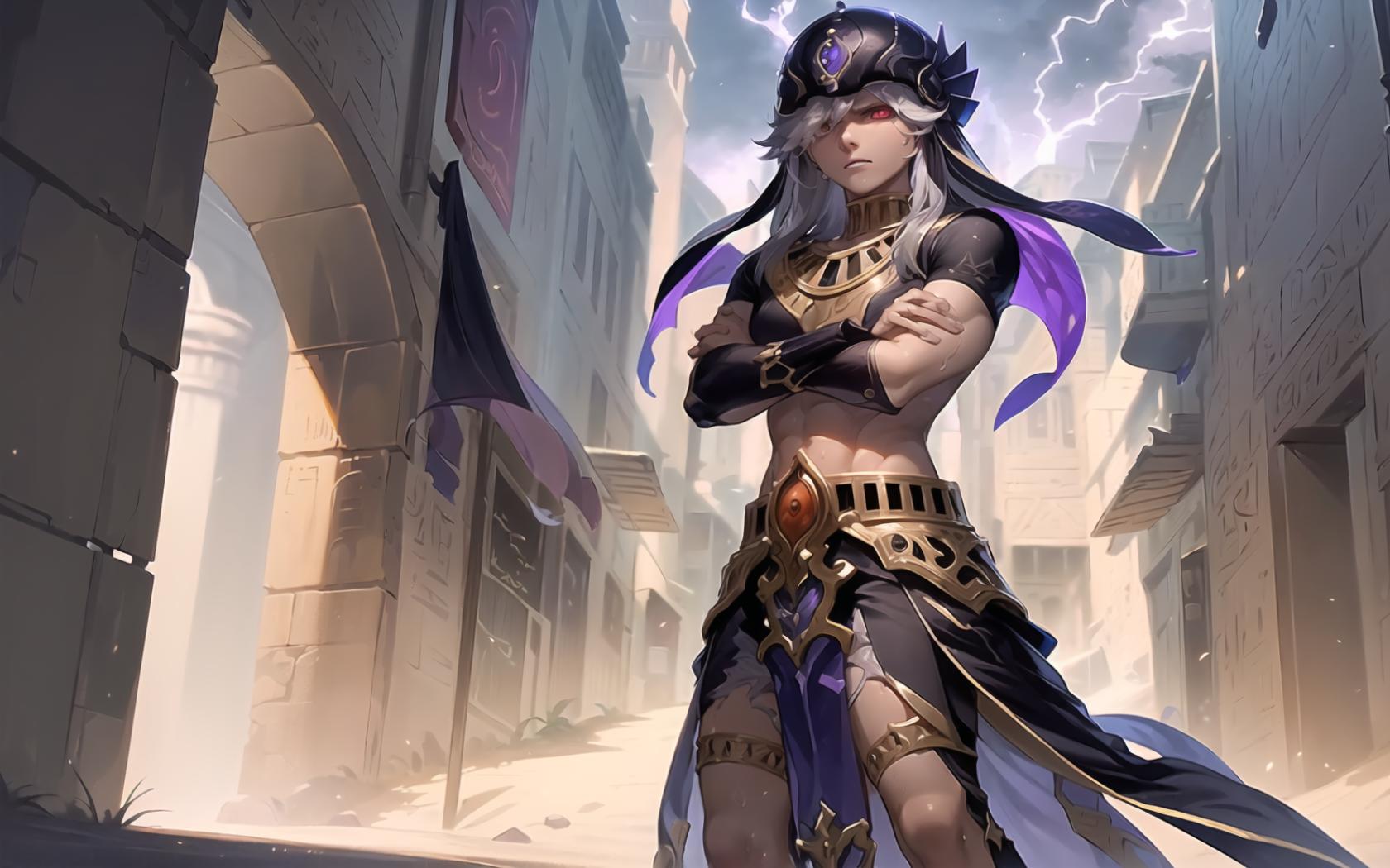 1boy, animal hat, arabian clothes , bangs, black headwear, building, closed mouth, cloud, crossed arms, dark skin, dark-skinned male, day, egyptian clothes, from below, hair over one eye, hat, jewelry, long hair, looking at viewer, male focus, midriff, navel, necklace, outdoors, pelvic curtain, red eyes, sky, solo, standing, white hair