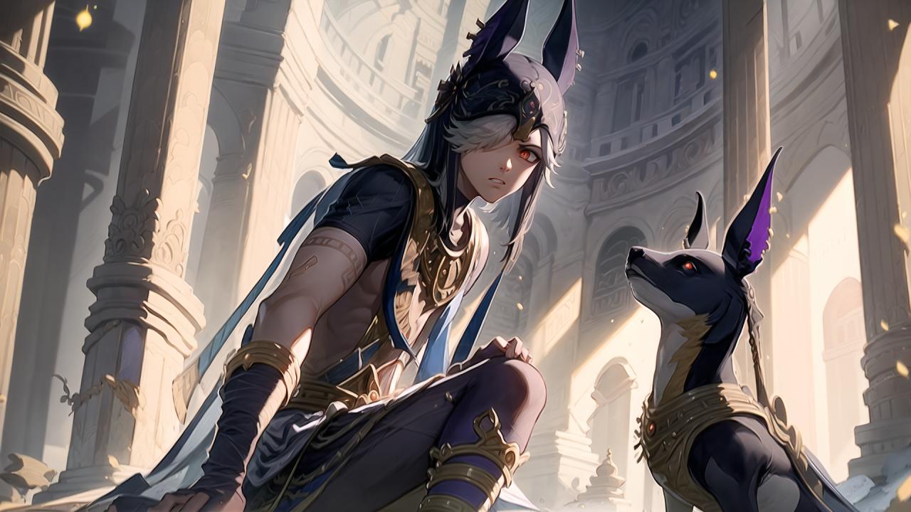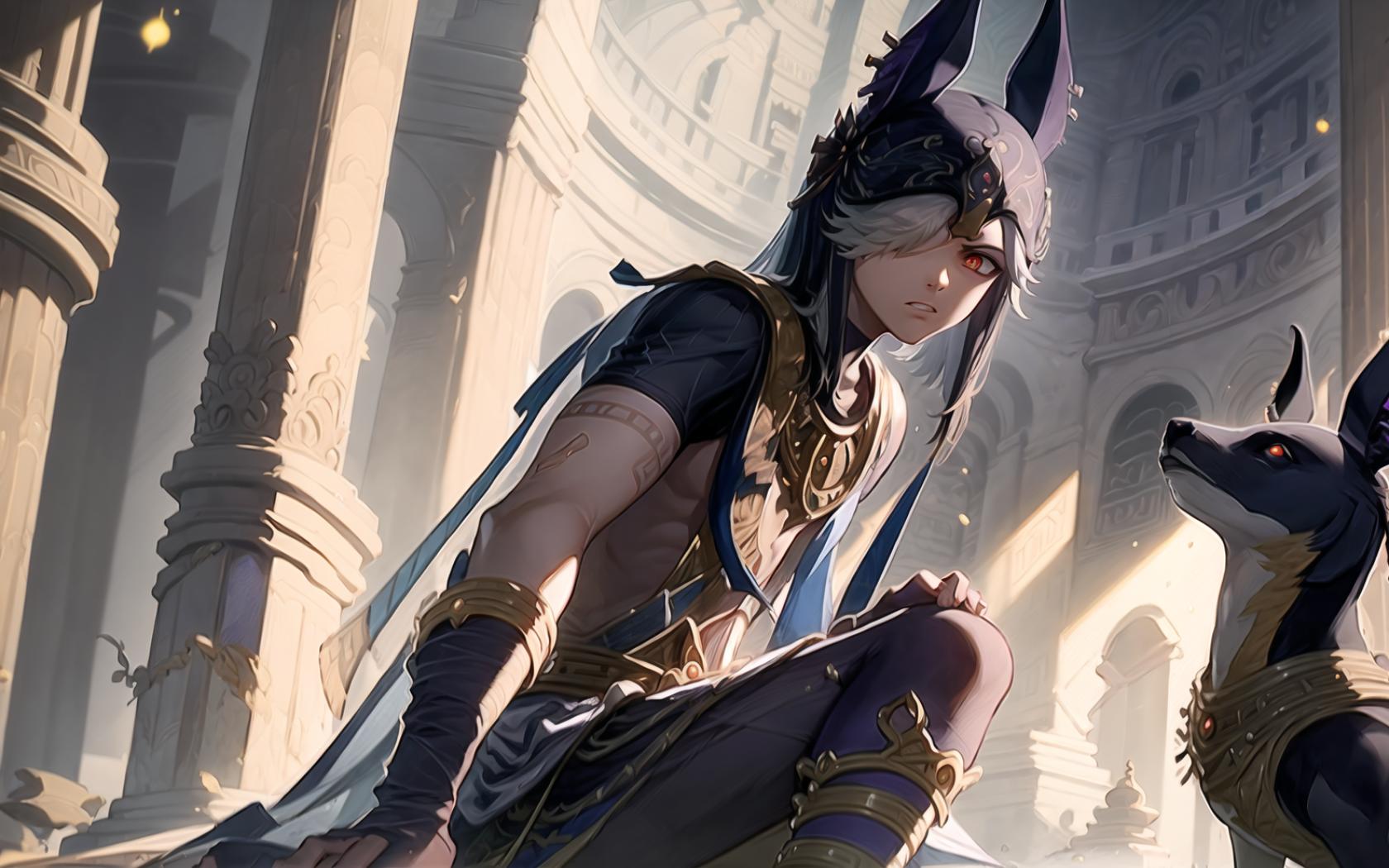 1boy, animal ears, animal hat, arabian clothes, bangs, black choker, black headwear, black pants, black shirt, cape, column , dark skin, dark-skinned male, day, egyptian clothes, eyelashes, feet out of frame, fingernails, gem, gloves, gold trim, grey hair, hair over one eye, hand on own knee, indoors, jackal ears, jewelry, knee up, long hair, looking at viewer, male focus, one eye covered, outdoors, pants, parted bangs, parted lips, pillar, red eyes, shirt, short sleeves, sidelocks, sitting, solo, swept bangs