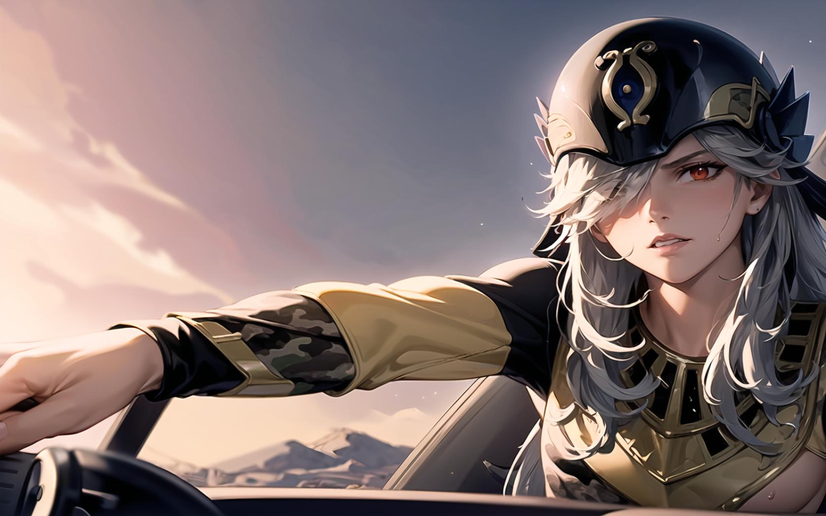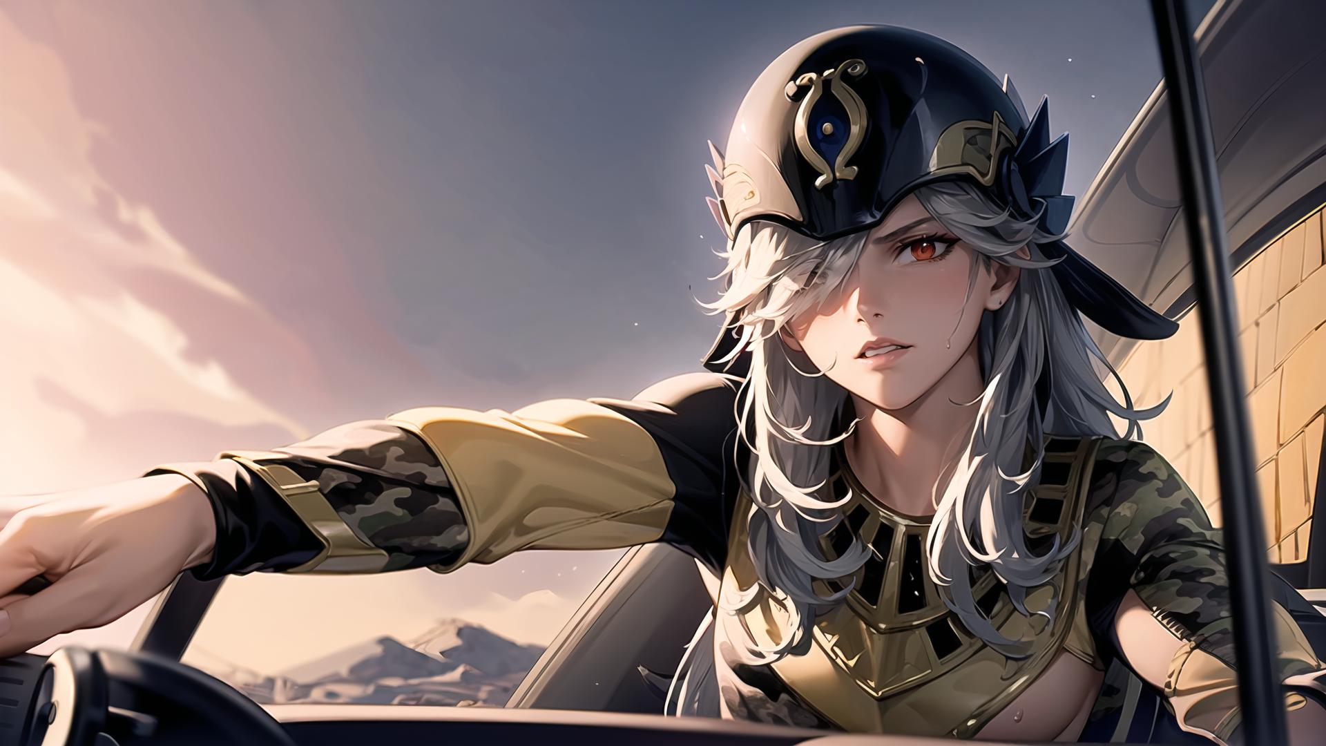 1boy, bangs, black headwear, cloud, dark skin, dark-skinned male, grey hair, ground vehicle, hair over one eye, hat, helmet, long hair, looking at viewer, male focus, motor vehicle , outdoors, parted lips, red eyes, sky, solo, sweat, upper body, white hair