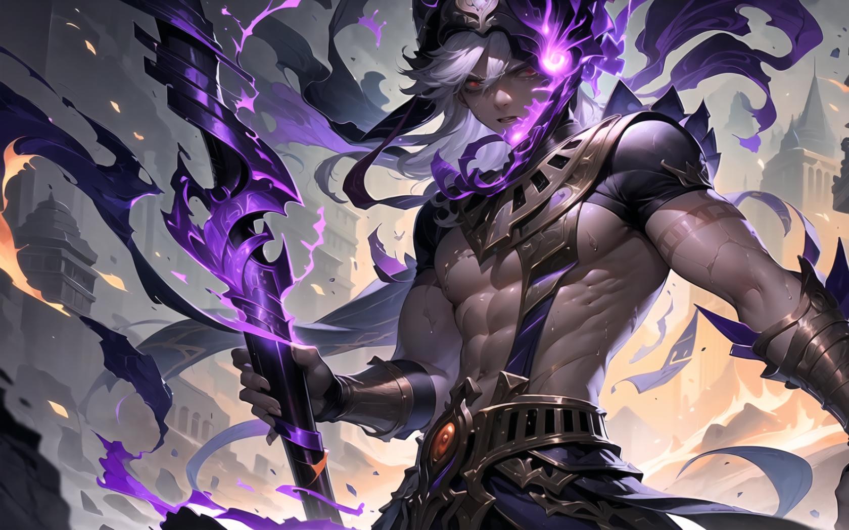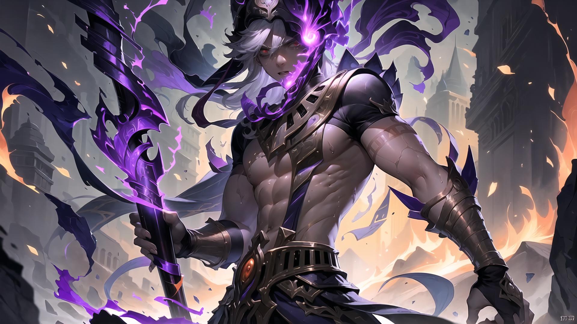 1boy, abs, animal hat, artist name, bangs, belt, black choker, black gloves, black headwear, black sclera, building, choker, colored sclera, dark skin, dark-skinned male, debris , fingerless gloves, gloves, glowing, hair over one eye, hat, holding, holding polearm, holding weapon, jewelry, long hair, looking at viewer, male focus, necklace, outdoors, parted bangs, parted lips, polearm, red eyes, ruins, short sleeves, sidelocks, solo, standing, stomach, sweat, weapon, white hair