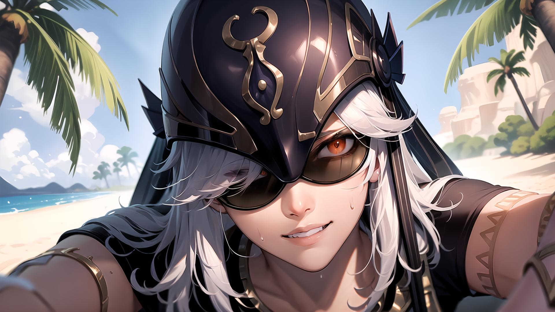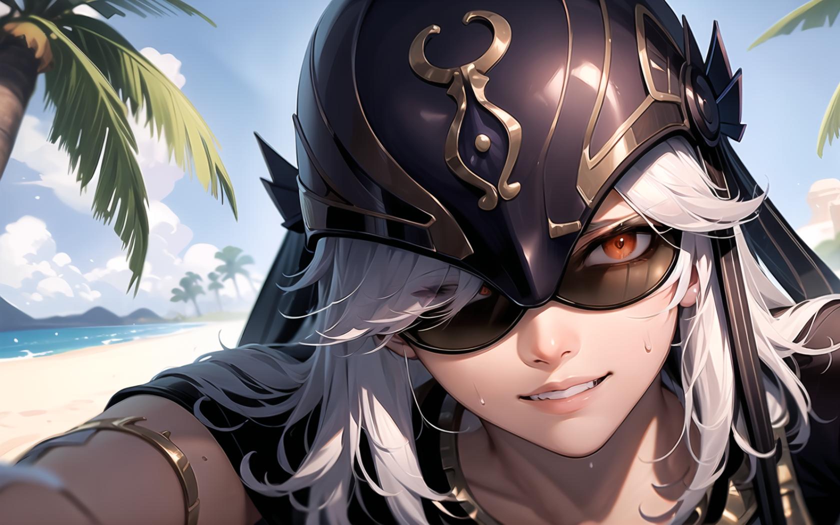 1boy, arabian clothes , armlet, bangs, beach, black headwear, blue sky, dark skin, dark-skinned male, day, eyelashes, eyes visible through hair, hair over one eye, hat, hood, jewelry, long hair, looking at viewer, male focus, necklace, outdoors, palm tree, parted bangs, parted lips, red eyes, sand, short sleeves, sky, smile, solo, sweat, tree, white hair