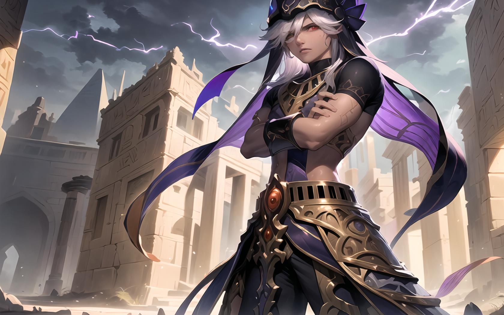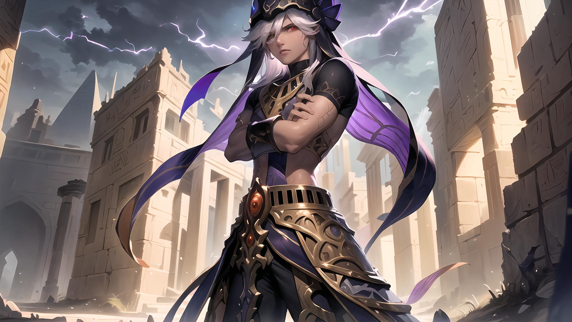 1boy, animal hat, arabian clothes , bangs, belt, black choker, black headwear, black pants, building, choker, closed mouth, cloud, cloudy sky, cowboy shot, crossed arms, dark skin, dark-skinned male, electricity, fingernails, grey hair, hair between eyes, hair over one eye, hat, jackal ears, jewelry, lightning, long hair, looking at viewer, male focus, outdoors, pants, red eyes, short sleeves, sky, solo, standing, white hair