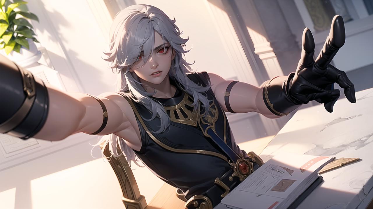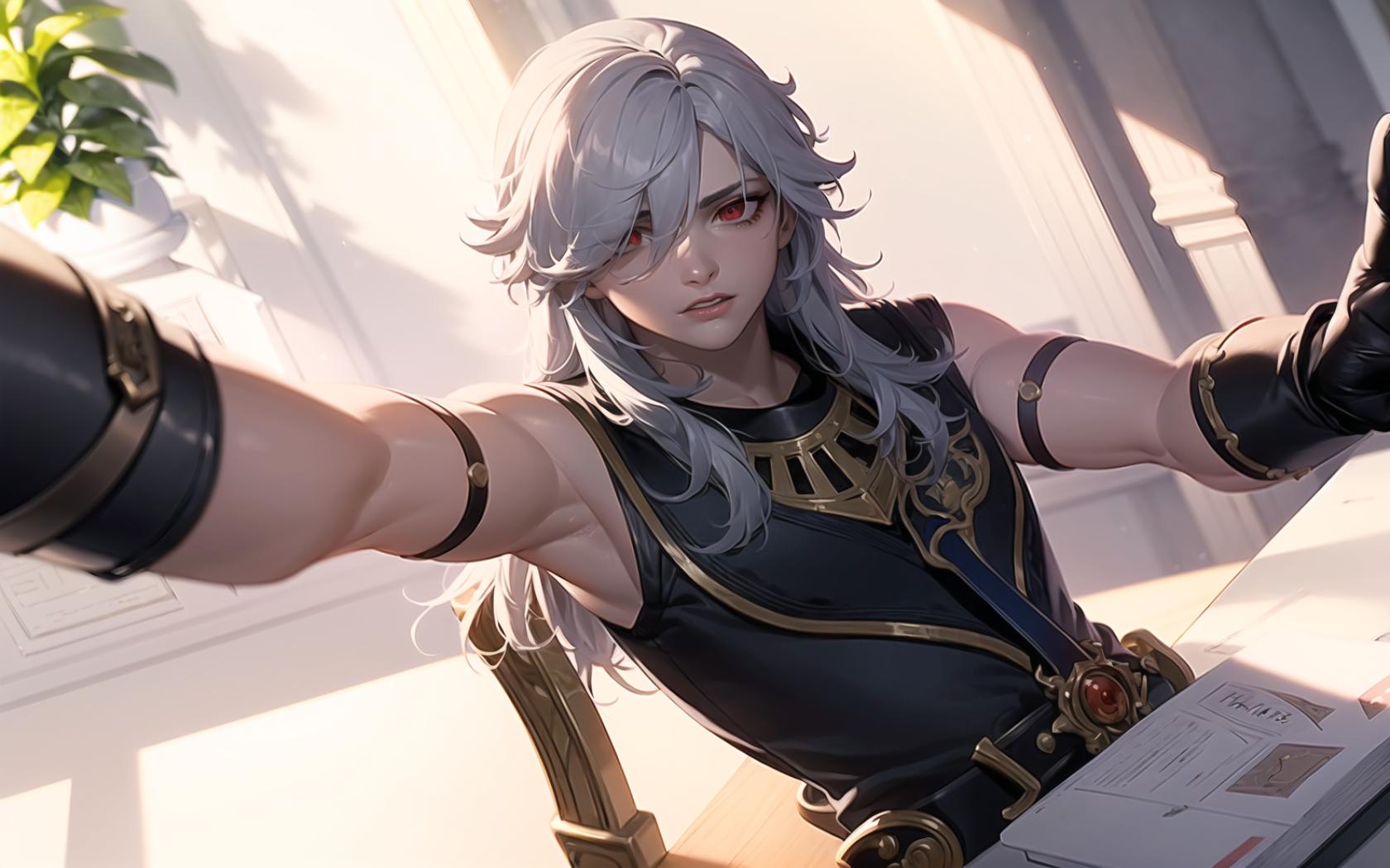 1boy, arm belt , arm strap, armlet, armpits, bangs, bare shoulders, belt, black gloves, black shirt, book, buckle, chair, dutch angle, eyelashes, gloves, grey hair, hair between eyes, hair over one eye, indoors, jewelry, long hair, looking at viewer, male focus, open book, outstretched arm, outstretched arms, paper, parted bangs, parted lips, plant, potted plant, reaching towards viewer, red eyes, shirt, sitting, sleeveless, sleeveless shirt, solo, sunlight, swept bangs, upper body, white hair, window