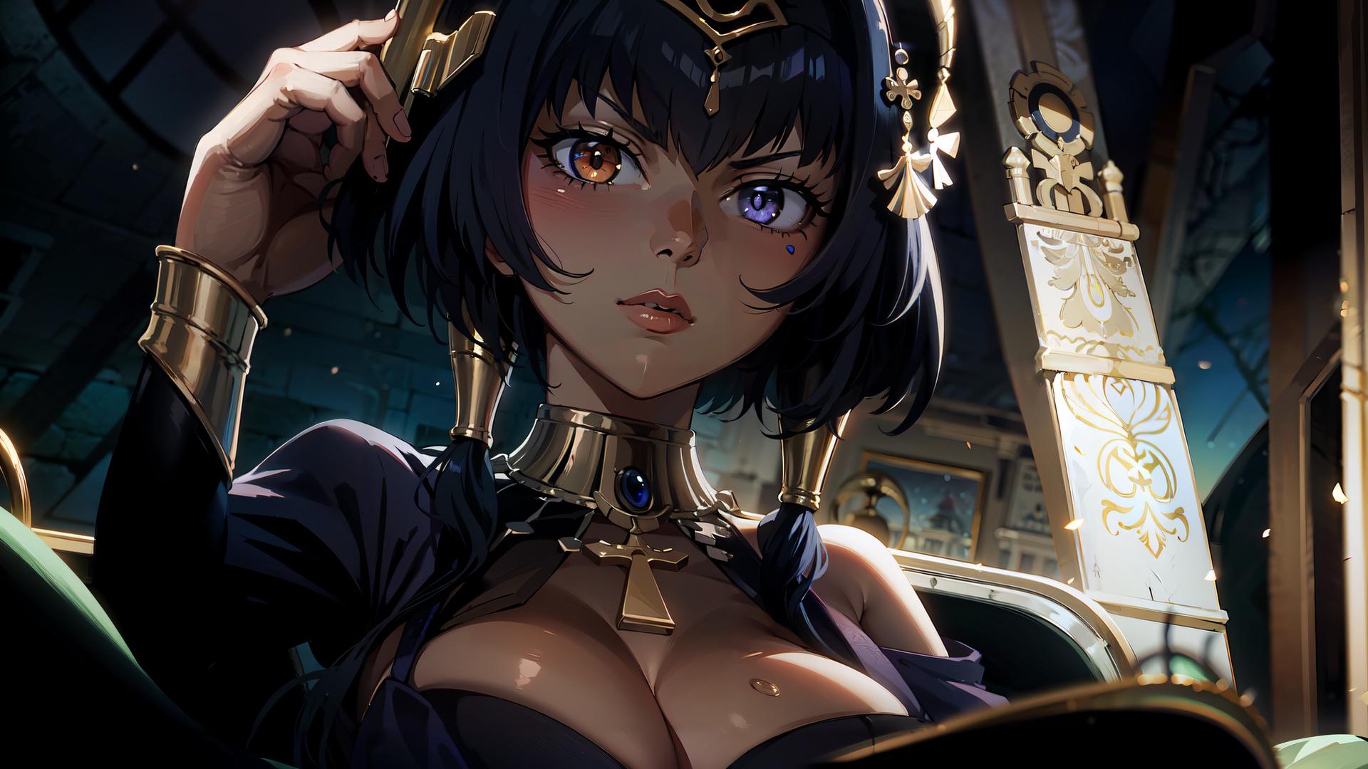 1girl, bangs, bare shoulders, black hair, blue eyes, blue hair, cleavage, dark skin, dark-skinned female, egyptian clothes, eye of horus , forehead jewel, hair ornament, heterochromia, jewelry, large breasts, looking at viewer, neck ring, parted lips, purple eyes, short hair with long locks, solo, upper body, yellow eyes