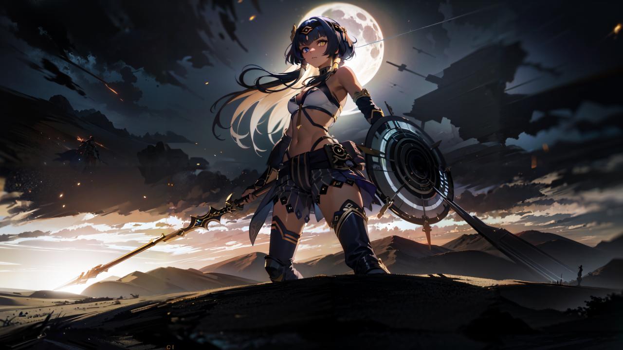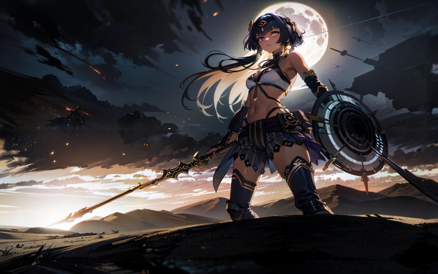 1girl, bangs, bare shoulders, black hair, blue eyes, blue skirt, cloud, crop top, dark skin, dark-skinned female, eye of horus , hairband, heterochromia, highleg panties, holding, holding shield, holding sword, holding weapon, long hair, looking at viewer, medium breasts, midriff, moon, navel, outdoors, shield, sidelocks, skirt, sky, small breasts, solo, standing, stomach, sword, thighhighs, underwear, weapon, yellow eyes