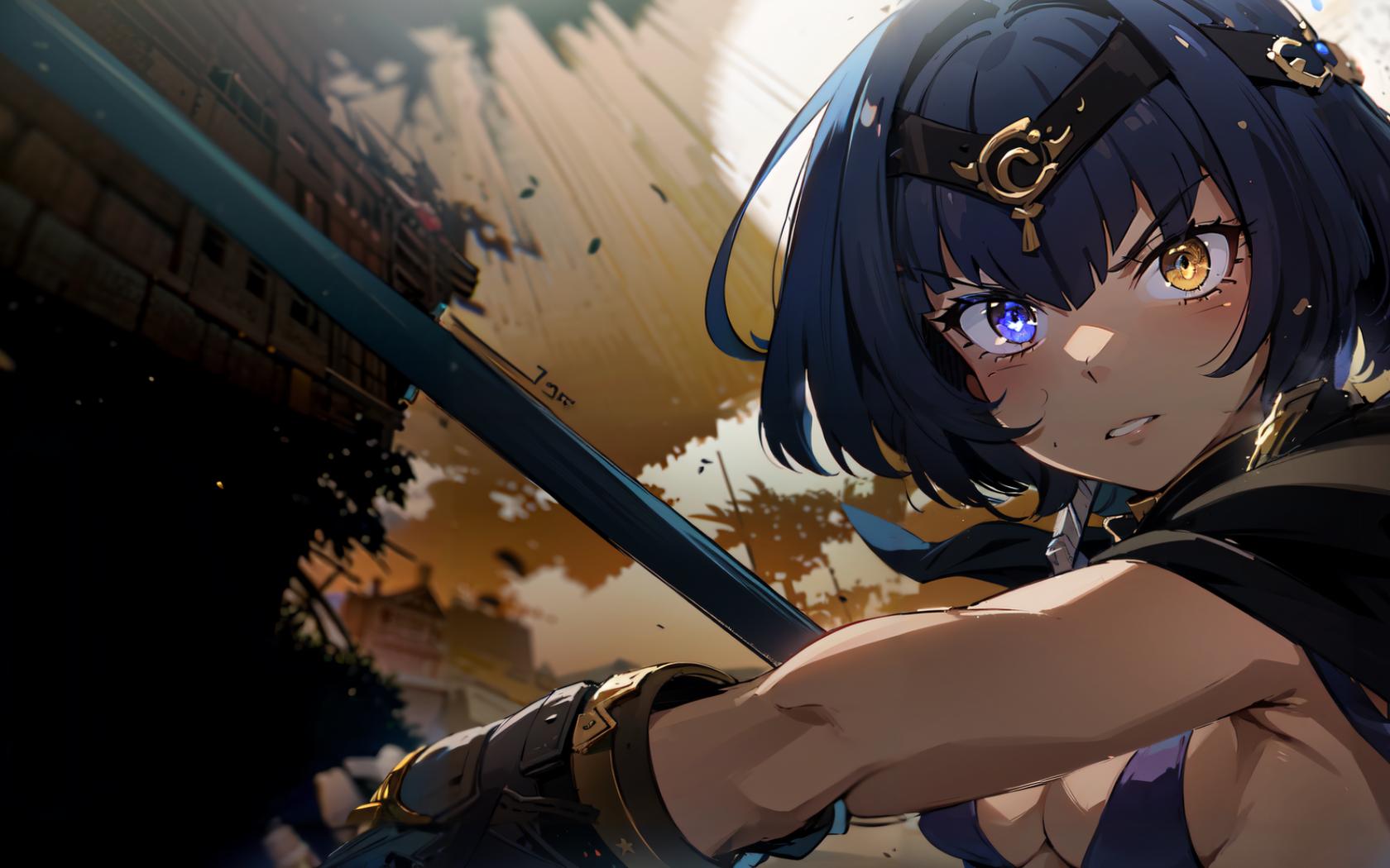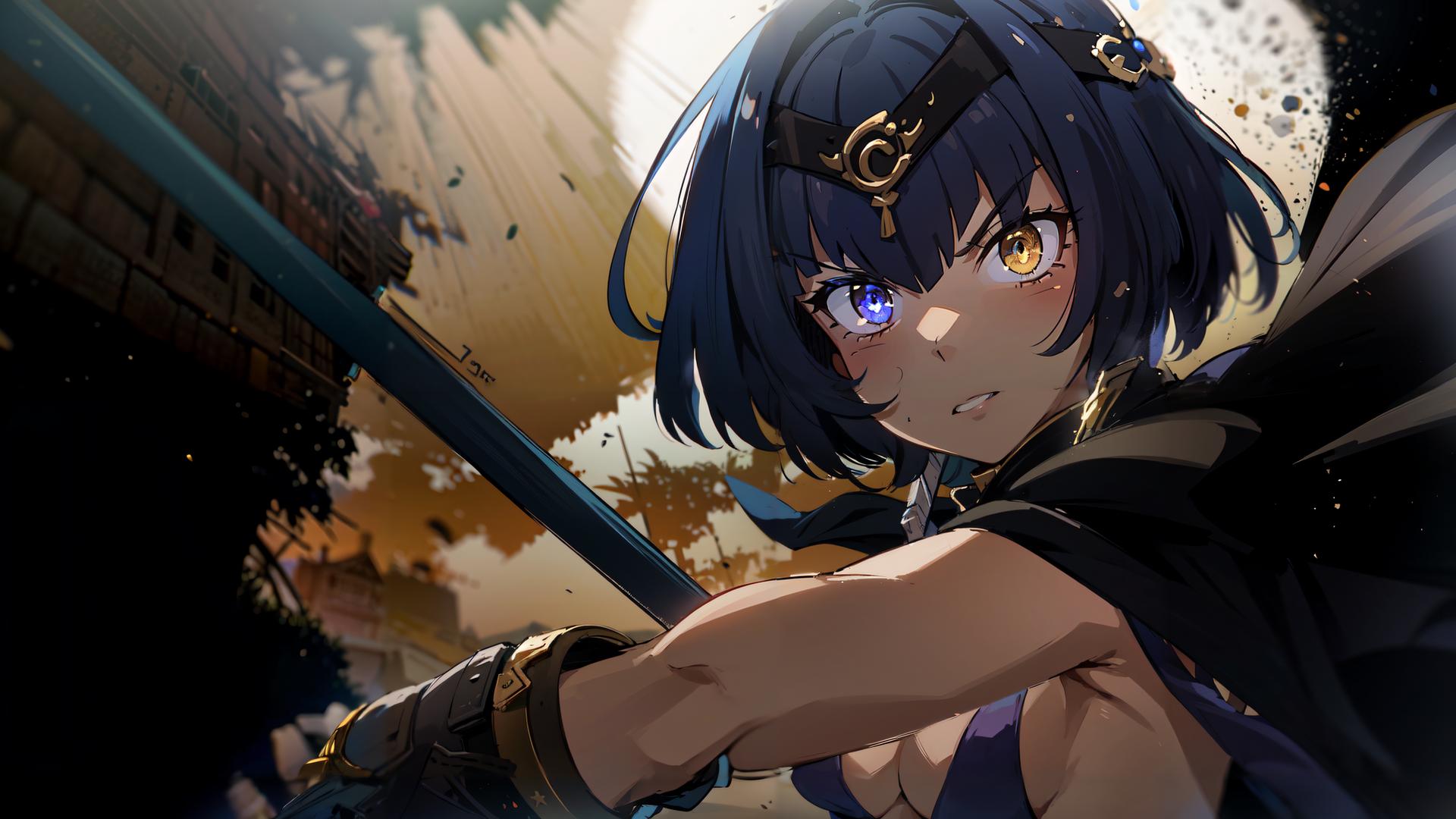 anime girl holding two swords near a dark background of yellow clouds and the sun above her neck with gold rings above her head and purple and