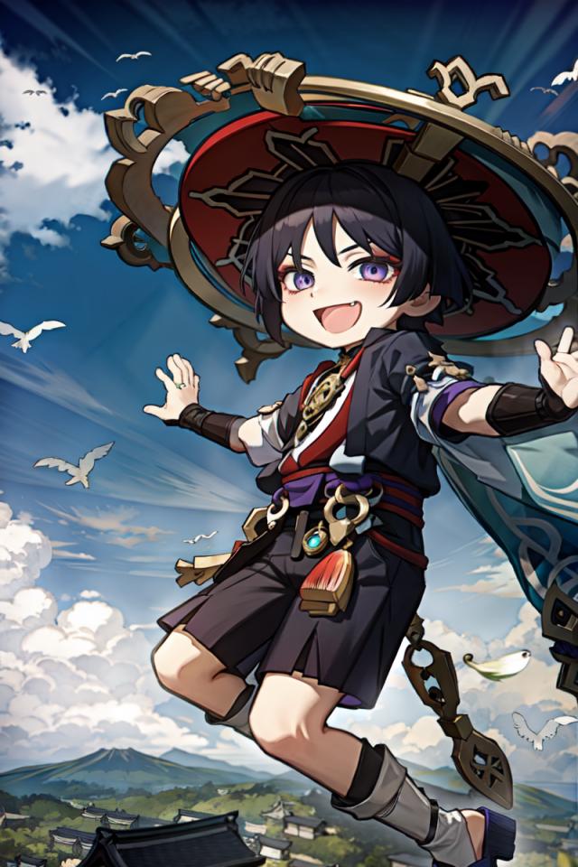 1boy, aged down, bangs, bird, black hair, black shorts, cloud, day, fang, hat, japanese clothes, jingasa, kurokote , looking at viewer, male focus, open mouth, outdoors, purple eyes, red headwear, sandals, short hair, shorts, sky, smile, solo