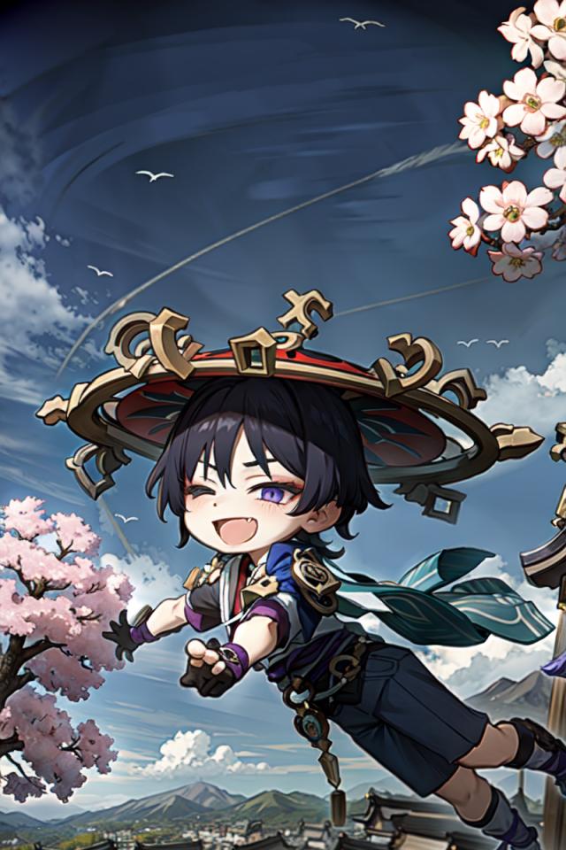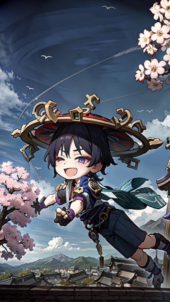 1boy, armor, bangs, bird, black hair, branch, cherry blossoms, chibi, cloud, fingerless gloves, gloves, hat, japanese armor, japanese clothes, jingasa, kote, kurokote , looking at viewer, male focus, one eye closed, open mouth, outdoors, purple eyes, short hair, shorts, sky, smile, solo, tree, vision (genshin impact)