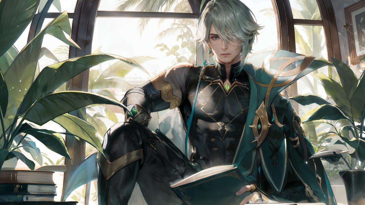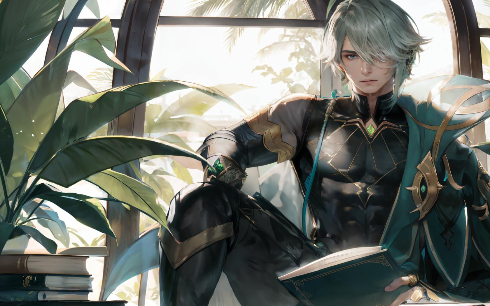 1boy, abs, bangs, black gloves, black pants, black shirt, book, book stack, cable, cape, closed mouth, covered abs , day, eyelashes, feet out of frame, gem, gloves, gold trim, green cape, green eyes, grey hair, hair over one eye, holding, holding book, indoors, jewelry, knee up, leaf, looking at viewer, male focus, one eye covered, open book, pants, parted bangs, plant, potted plant, shirt, short hair, sidelocks, sitting, sleeveless, sleeveless shirt, solo, sunlight, swept bangs, window