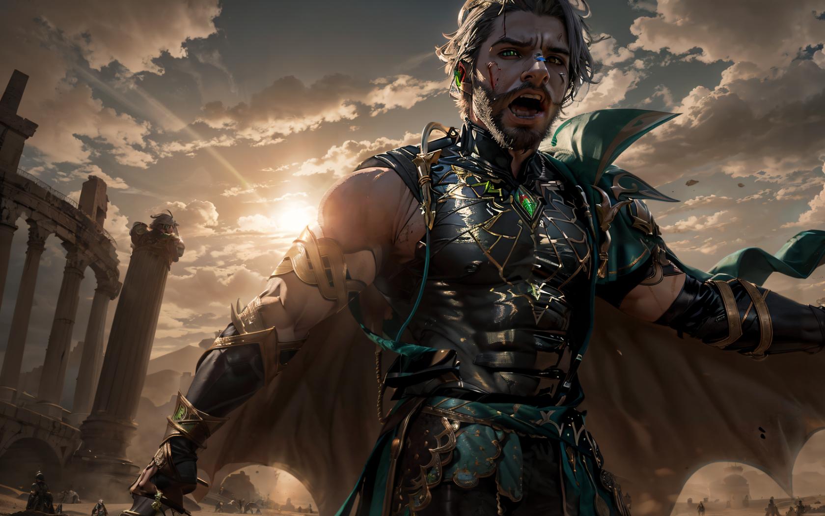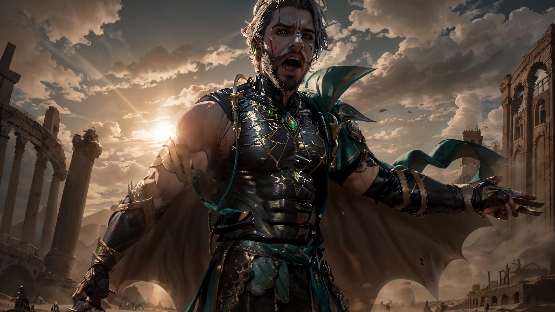 1boy, armor, beard, blood, blood on face, blue eyes, cape, cloud, cloudy sky, crying, facial hair, fingerless gloves, gem, gloves, grey hair, holding, male focus, manly , muscular, open mouth, outdoors, sky, solo, weapon