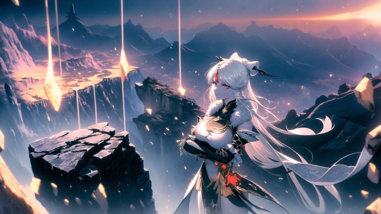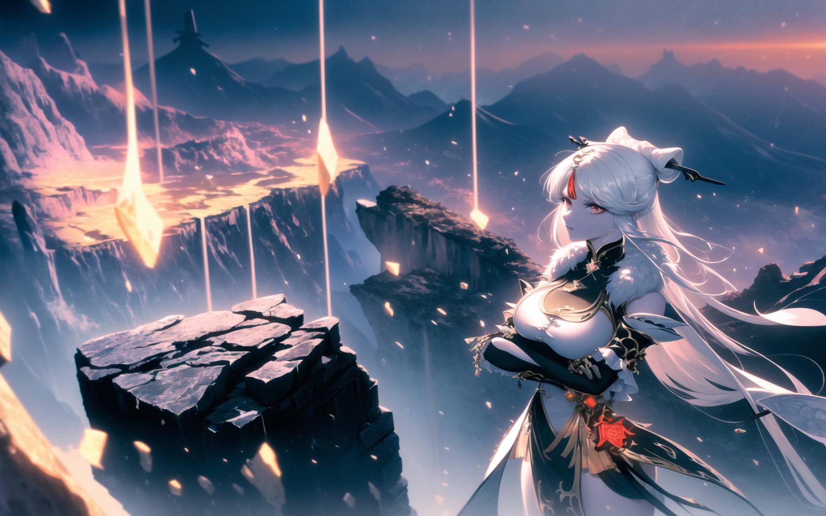 | Prompt | (dramatic:1.4), (highly detailed:1.5), (realistic:1.05),(digital art:1.7),(romantic:1.4), <lora:beautiful-eyes:1>, (epic:1.7, perfect artwork), best quality,dynamic pose,sharp focus,(8k), (4k),(Masterpiece), (Best Quality), fantasy, extremely detailed, intricate, hyper detailed, (perfect face), illustration,soft lighting, Ultra detailed fantasy environment, clearly worked out detail, intricate, cinematic,(depth of field), (dramatic lighting:1.2), <lora:ningguang2:1>ningguangdef, (mature:1.4), nedium breasts,1girl, solo, day,sunrise, outdoors, mountains background, (rock shards:1.2), (standing upright top of a tall cliff:1.6), (chinese medieval town below:1.2), (rich chinese medieval mansion on a huge rock floating high overhead:1.7), (crossed arms:1.4), light smile, (sexy), proud, confident, (looking at viewer), (full body), |