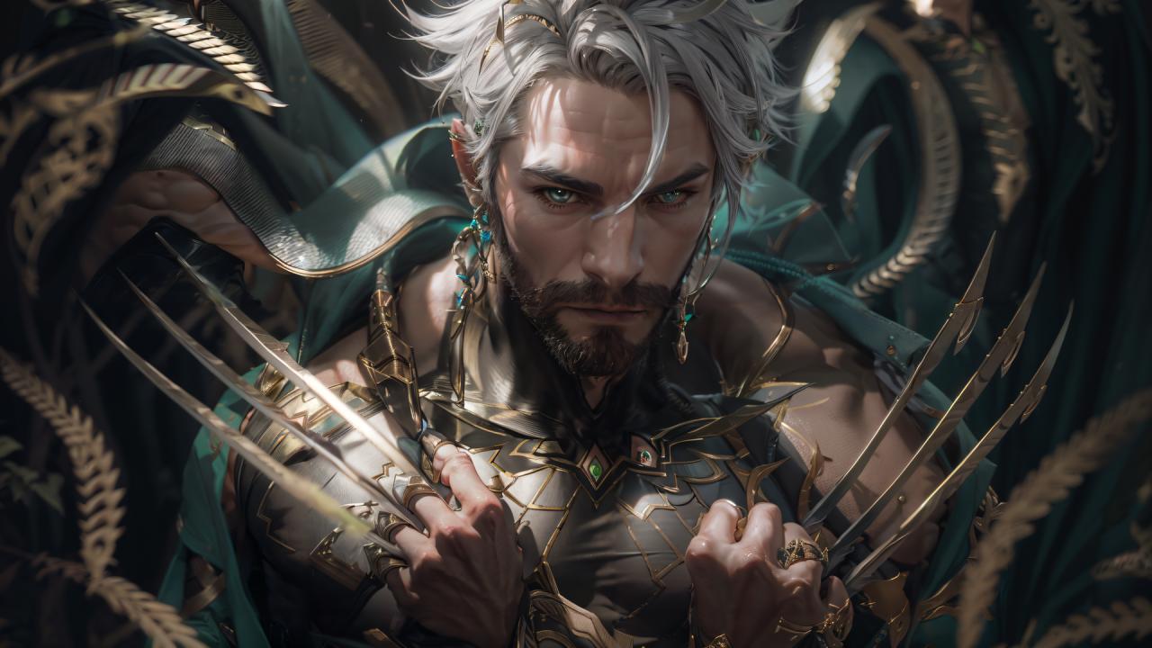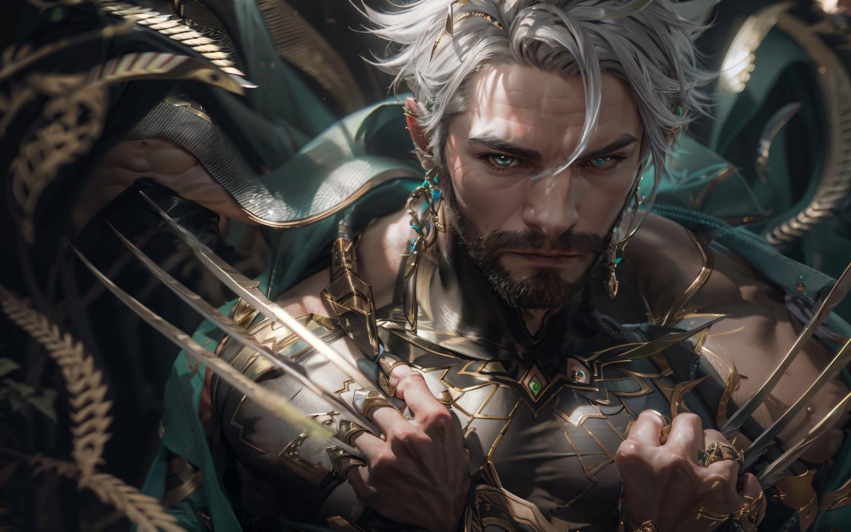 1boy, beard, closed mouth, earrings, facial hair, green eyes, grey hair, holding, jewelry, knife, looking at viewer, male focus, manly , mature male, muscular, muscular male, piercing, scar, short hair, solo, upper body, white hair