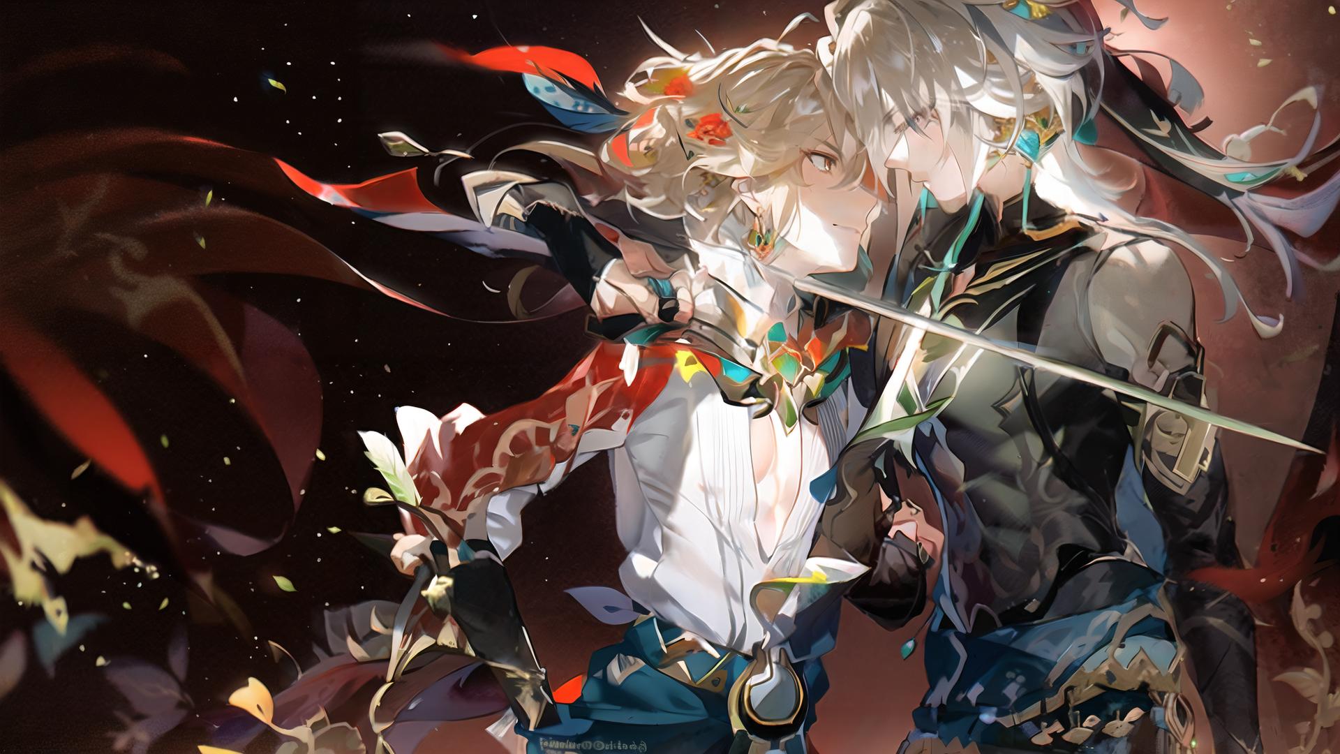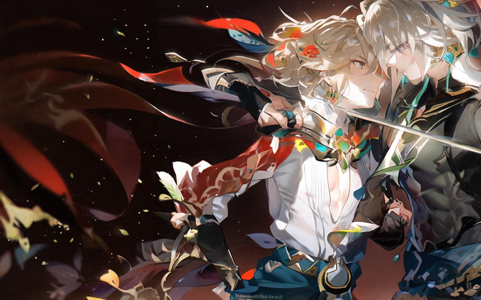 2boys, abs, bangs, black gloves, black shirt, blonde hair, cape, closed mouth, earrings, elbow gloves, eye contact, feather hair ornament , feathers, fingerless gloves, gloves, grey hair, hair between eyes, hair ornament, holding, jewelry, looking at another, male focus, multicolored hair, multiple boys, red cape, shirt, short hair, sidelocks, sleeveless, sleeveless shirt, smile, white shirt