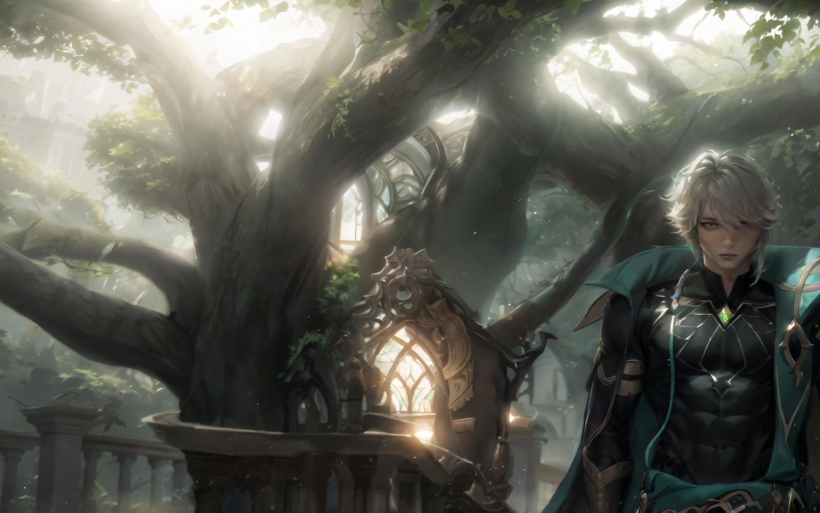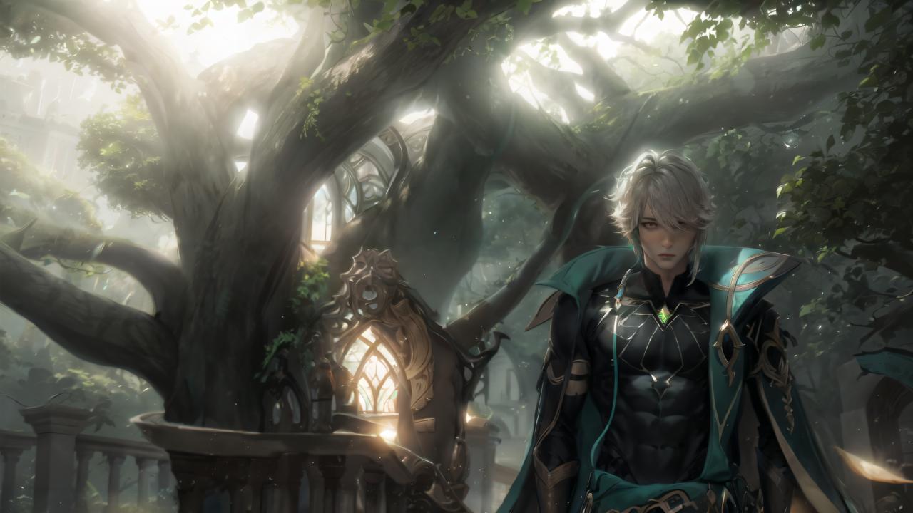 1boy, abs, bangs, black gloves, black shirt, cape, covered abs, covered navel, day, forest, gem, gloves, green cape, green eyes, grey hair, hair over one eye, jewelry, leaf, light particles, light rays, looking at viewer, male focus, muscular, nature, one eye covered, open clothes, outdoors, parted bangs, parted lips, plant, shirt, short hair, sleeveless, sleeveless shirt, solo, sunlight, swept bangs, tight shirt , tree, upper body