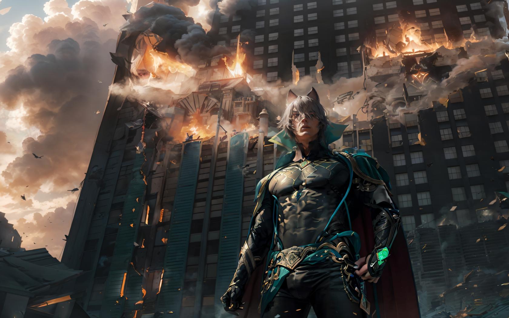 1boy, animal ears, belt, black cape, black pants, building, cape, city, cloud, covered abs, destruction , explosion, fire, gloves, grey hair, hand on hip, male focus, muscular, outdoors, pants, sky, skyscraper, smoke, solo, standing, white hair