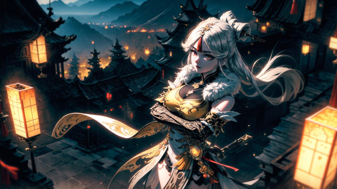 | Prompt | (dramatic:1.4), (highly detailed:1.5), (realistic:1.05),(digital art:1.7),(romantic:1.4), <lora:beautiful-eyes:1>, (epic:1.7, perfect artwork), best quality,dynamic pose,sharp focus,(8k), (4k),(Masterpiece), (Best Quality), fantasy, extremely detailed, intricate, hyper detailed, (perfect face), illustration,soft lighting, Ultra detailed fantasy environment, clearly worked out detail, intricate, cinematic,(depth of field), (dramatic lighting:1.2), <lora:ningguang2:1>ningguangdef, (mature:1.4), nedium breasts,1girl, solo, day,sunrise, outdoors, mountains background, (rock shards:1.2), (standing upright top of a tall cliff:1.6), (chinese medieval town below:1.4), (rich chinese medieval mansion on a huge rock floating high above:1.7), (crossed arms:1.4), light smile, (sexy), proud, confident, (looking at viewer), (full body), |