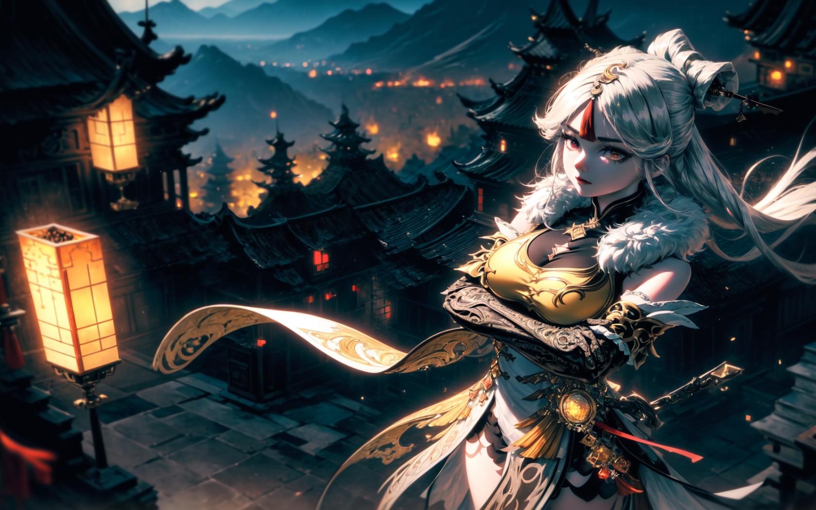 1girl, architecture, bangs, bare shoulders, black gloves, china dress, chinese clothes, claw ring , crossed arms, dress, east asian architecture, elbow gloves, fur collar, fur trim, gloves, hair ornament, hair stick, hairpin, lantern, large breasts, long hair, looking at viewer, mountain, night, outdoors, paper lantern, parted bangs, red eyes, solo, tassel, vision (genshin impact), white hair
