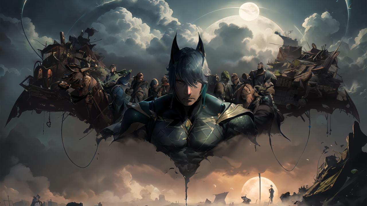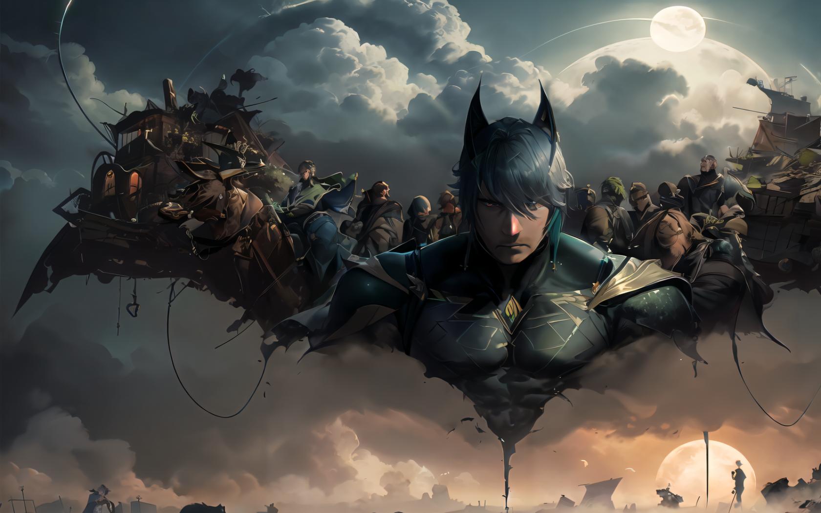 6+boys, airship , armor, cape, cloud, cloudy sky, full moon, male focus, moon, multiple boys, night, sky
