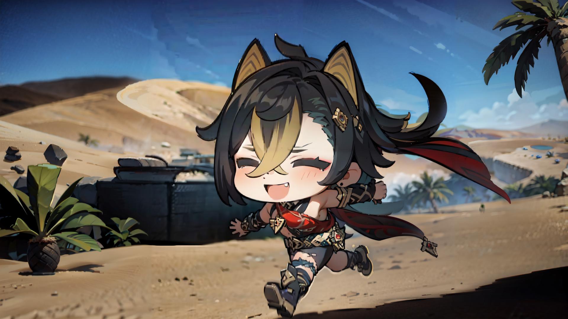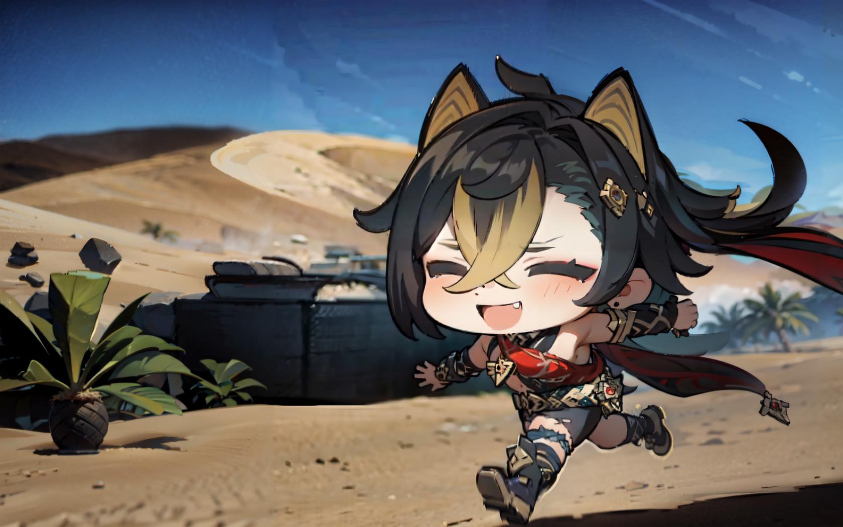 1girl, animal ears, asymmetrical clothes, bangs, beach, black hair, blonde hair, blue sky, blush, boots, cactus , chibi, closed eyes, crossed bangs, dark skin, dark-skinned female, day, desert, earrings, fang, fingerless gloves, gloves, hair between eyes, hair ears, halterneck, jewelry, long hair, multicolored hair, open mouth, outdoors, palm tree, running, sand, single pantsleg, sky, smile, solo, streaked hair, tree