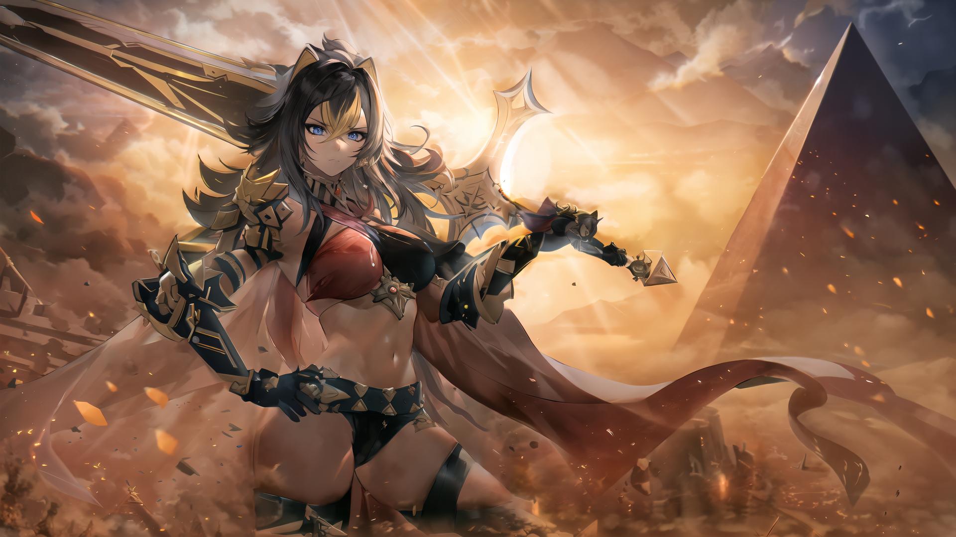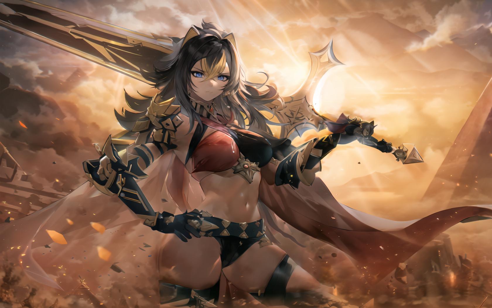 1girl, animal ears, armor, asymmetrical clothes, bangs, belt, black gloves, black hair, blonde hair, blue eyes, cape, closed mouth, cloud, cowboy shot, criss-cross halter, crossed bangs, dark skin, dark-skinned female, elbow gloves, gauntlets, gloves, hair between eyes, hair intakes, halterneck, hand on hip, holding, holding sword, holding weapon, large breasts, long hair, looking at viewer, multicolored hair, navel, outdoors, over shoulder, sky, solo, standing, stomach, streaked hair, sword, sword over shoulder , weapon, weapon over shoulder