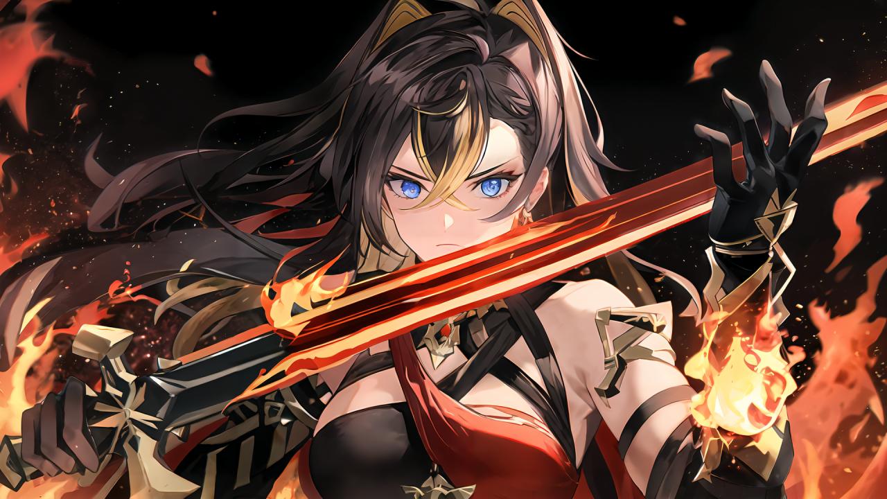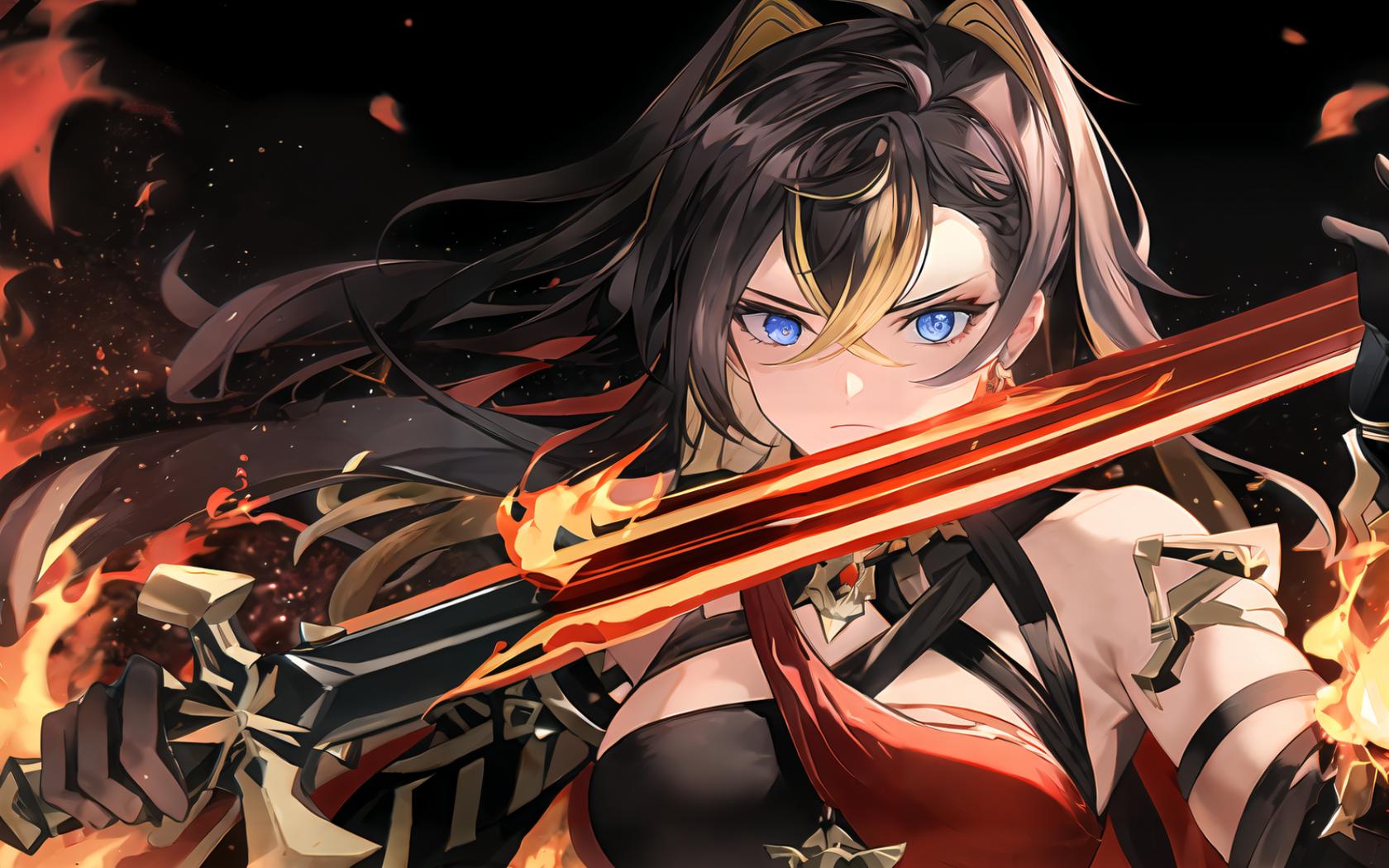 1girl, bangs, bare shoulders, black background, black gloves, black hair, blonde hair, blue eyes, closed mouth, criss-cross halter, crossed bangs, earrings, embers , fire, gloves, hair between eyes, hair intakes, halterneck, holding, holding sword, holding weapon, jewelry, long hair, looking at viewer, multicolored hair, serious, solo, streaked hair, sword, two-tone hair, upper body, weapon
