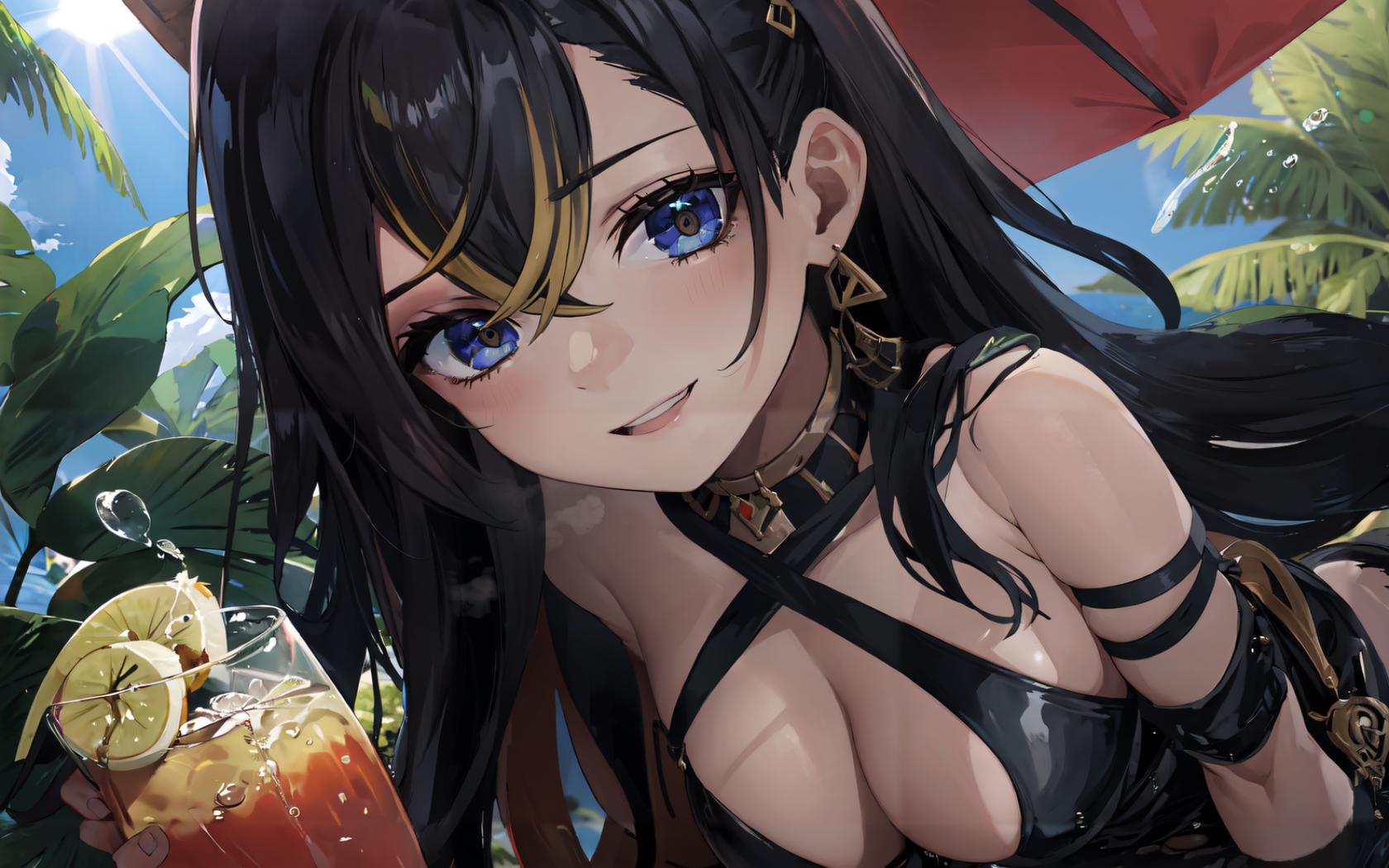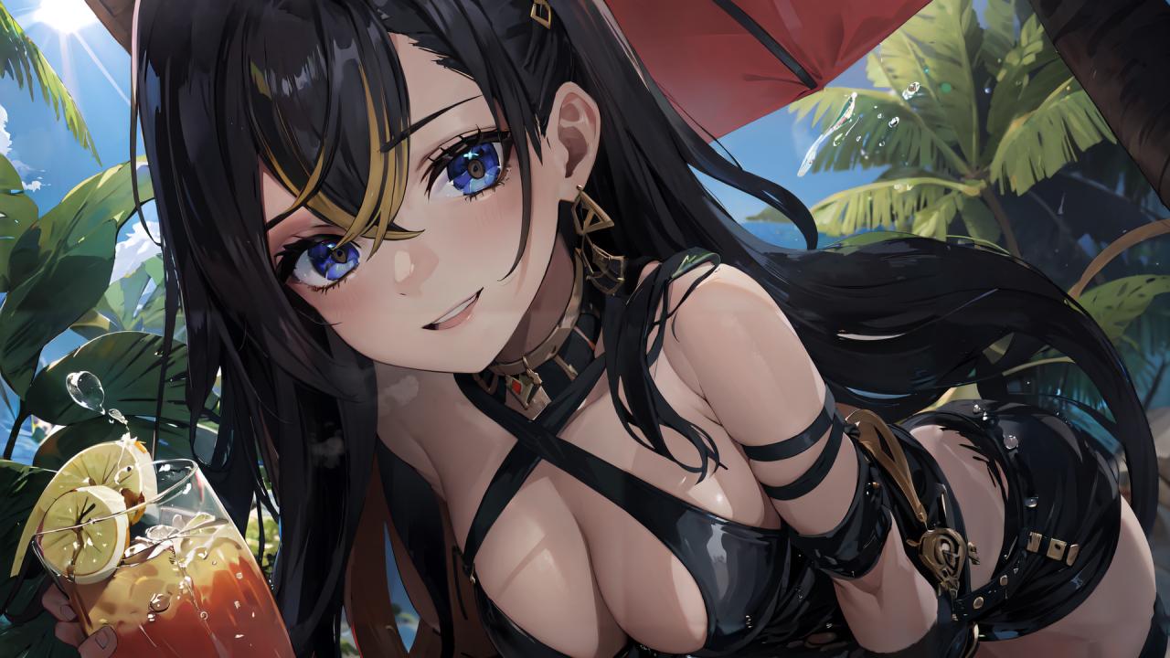 1girl, bangs, bare shoulders, black hair, black shorts, blonde hair, blue eyes, blue sky, blush, breath, cleavage, criss-cross halter, crossed bangs, cup, dark skin, dark-skinned female, day, drink, earrings, food, fruit, hair between eyes, halterneck, holding, holding cup, jewelry, large breasts, leaning forward, lemon , long hair, looking at viewer, medium breasts, multicolored hair, open mouth, outdoors, palm tree, short shorts, shorts, sky, smile, solo, streaked hair, tree