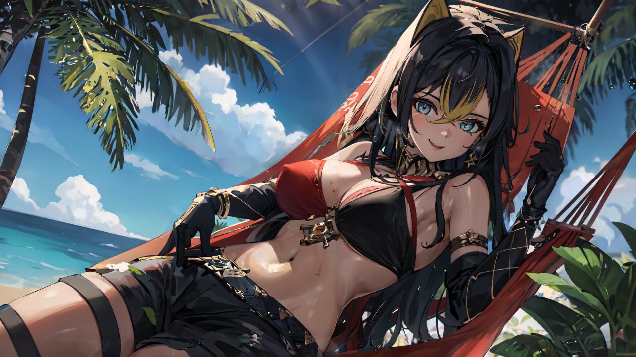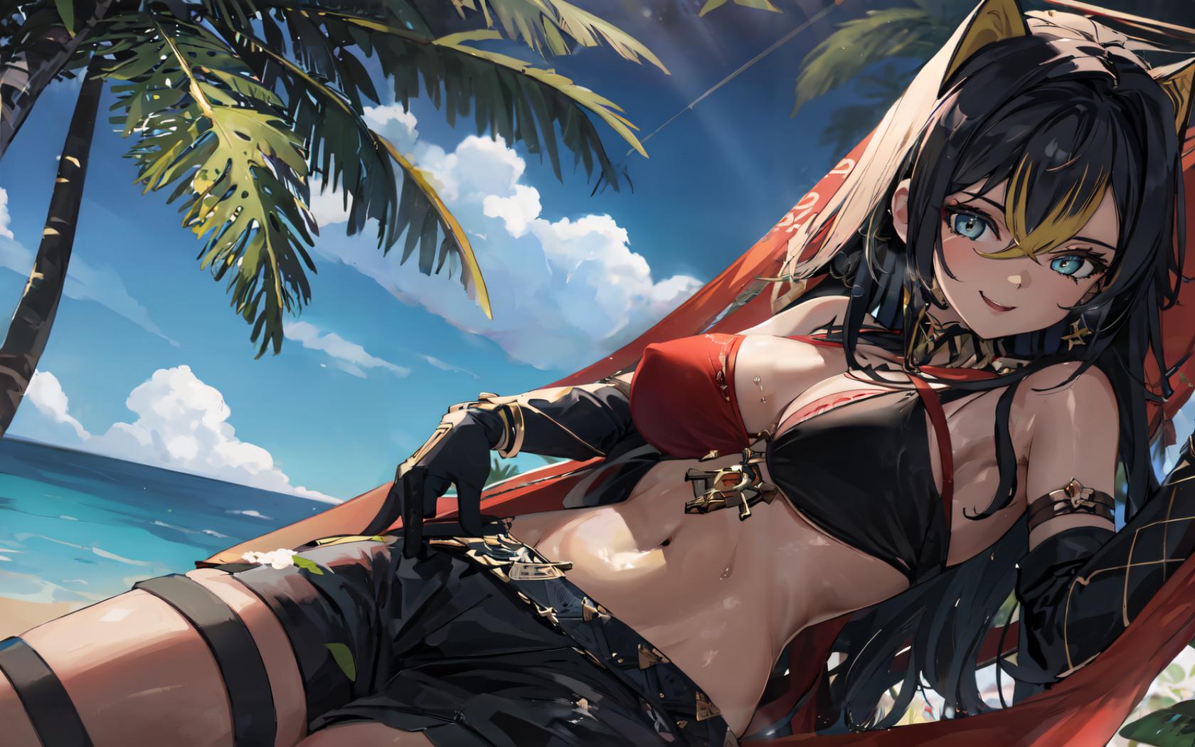 1girl, animal ears, armlet, bangs, bare shoulders, beach, belt, bikini, bikini top only, black bikini, black gloves, black hair, black pants, black shorts, blonde hair, blue eyes, blue sky, cleavage, cloud, cowboy shot, criss-cross halter, crossed bangs, dangle earrings, dark skin, dark-skinned female, day, earrings, elbow gloves, gloves, hair between eyes, hair intakes, halterneck, hammock , jewelry, large breasts, long hair, looking at viewer, multicolored hair, navel, ocean, open mouth, outdoors, palm tree, red bikini, shorts, sky, smile, solo, stomach, streaked hair, sweat, swimsuit, thigh strap, tree, two-tone hair