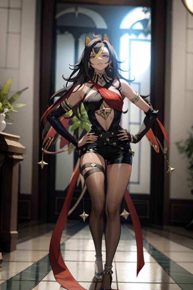 1girl, alternate costume, animal ears, armlet, asymmetrical clothes, bangs, bare shoulders, black footwear, black gloves, black hair, black nails, black shorts, blonde hair, blue eyes, blue gemstone, checkered floor, closed mouth, colored tips, criss-cross halter, crossed bangs, dangle earrings , dark skin, dark-skinned female, detached sleeves, earrings, elbow gloves, fingerless gloves, full body, gem, gloves, hair between eyes, hair intakes, halterneck, hands on hips, high heels, indoors, jewelry, legs, long hair, looking at viewer, medium breasts, multicolored hair, nail polish, pantyhose, plant, potted plant, red gemstone, reflection, reflective floor, short shorts, shorts, sidelocks, smile, solo, standing, streaked hair, thigh strap, tile floor, tiles, two-tone hair, window