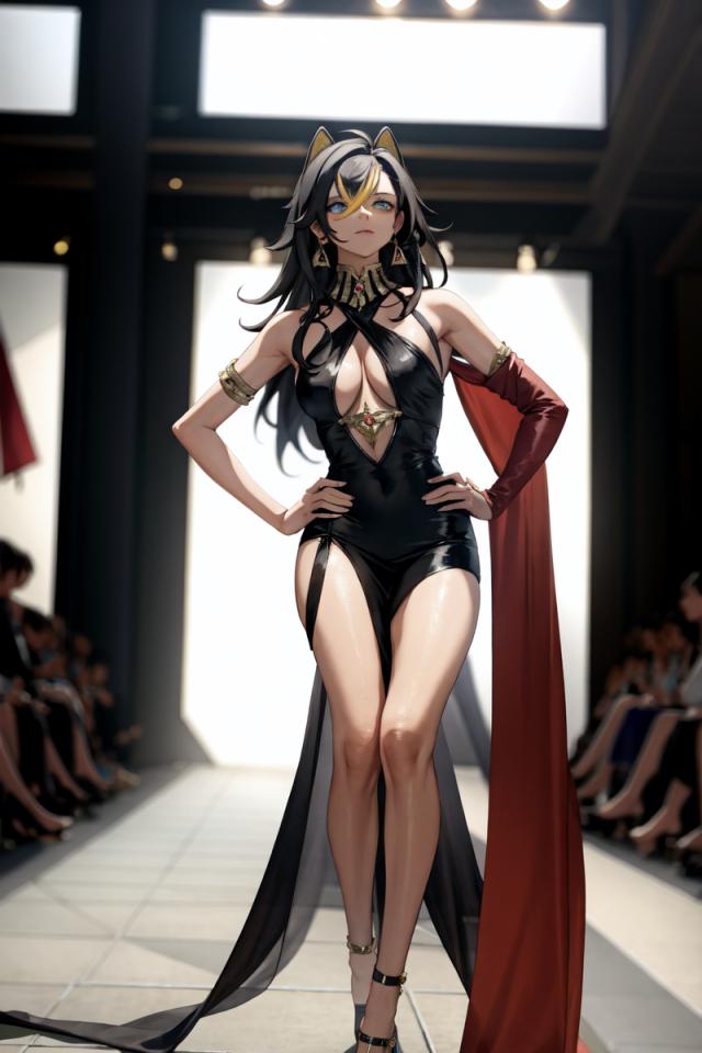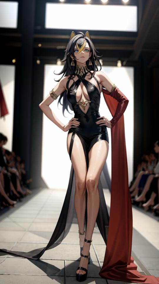 1girl, alternate costume, animal ears, armlet, bangs, bare arms, bare legs, bare shoulders, black dress, black footwear, black hair, blonde hair, blue eyes, blurry, blurry background, cleavage, closed mouth, cocktail dress , criss-cross halter, crossed bangs, dangle earrings, dark skin, dark-skinned female, depth of field, detached sleeves, dress, earrings, feet, full body, hair between eyes, hair intakes, halter dress, halterneck, hands on hips, high heels, indoors, jewelry, large breasts, legs, long dress, long hair, looking at viewer, multicolored hair, nail polish, pelvic curtain, red gemstone, reflective floor, sandals, side slit, sleeveless, sleeveless dress, solo, solo focus, standing, strappy heels, streaked hair, tile floor, tiles, toenails, toes, two-tone hair, very long hair