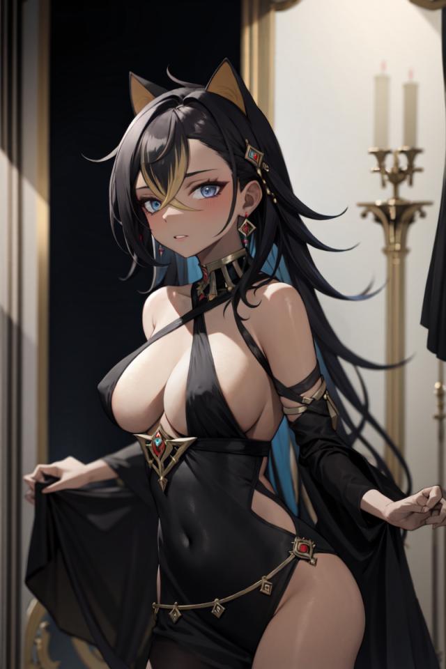 1girl, alternate costume, animal ears, asymmetrical clothes, bangs, bare shoulders, black dress, black hair, black nails, blonde hair, blue eyes, blurry, blush, candle, cleavage, covered navel, covered nipples, cowboy shot, criss-cross halter, crossed bangs, dangle earrings, dark skin, dark-skinned female, detached sleeves, dress, earrings, gem, gold choker , hair between eyes, hair intakes, hair ornament, halter dress, halterneck, indoors, jewelry, large breasts, long hair, long sleeves, looking at viewer, multicolored hair, nail polish, parted lips, pelvic curtain, red gemstone, skindentation, solo, standing, streaked hair, thigh strap, two-tone hair
